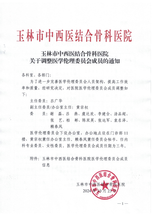 玉林市中西医结合骨科医院关于调整医学伦理委员会成员的通知
