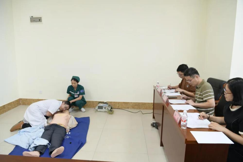 双人成人心肺复苏(CPR)操作是本次竞赛的重点。参赛选手展现出了极高的专业水准。他们动作迅速而准确,从判断患者意识、呼救、摆放体位,到胸外按压、球囊面罩通气、电除颤,每一步都严格按照急救操作标准执行。评委们专注细致观察着每一个细节,确保评分的公正与准确。比赛现场气氛紧张而激烈,选手们全力以赴,力求在模拟的紧急情况下,展现出最佳的急救技能。