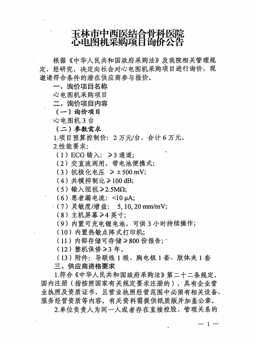 玉林市中西医结合骨科医院心电图机采购项目询价公告