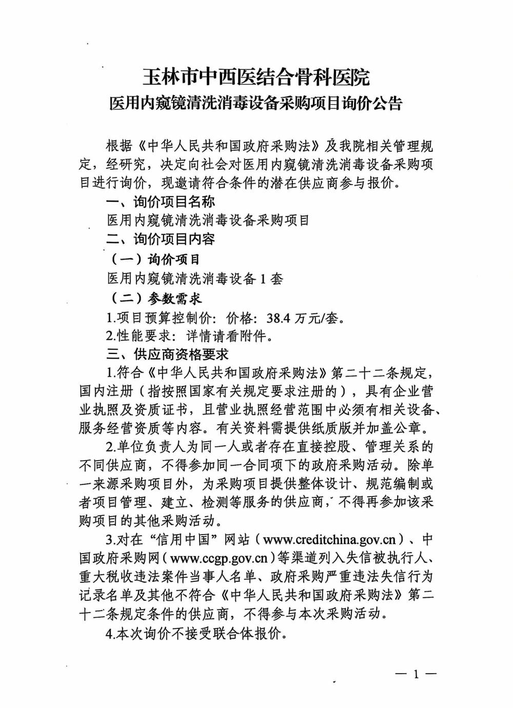 玉林市中西医结公骨科医院医用内窥镜清洗消毒设备采购项目询价公告