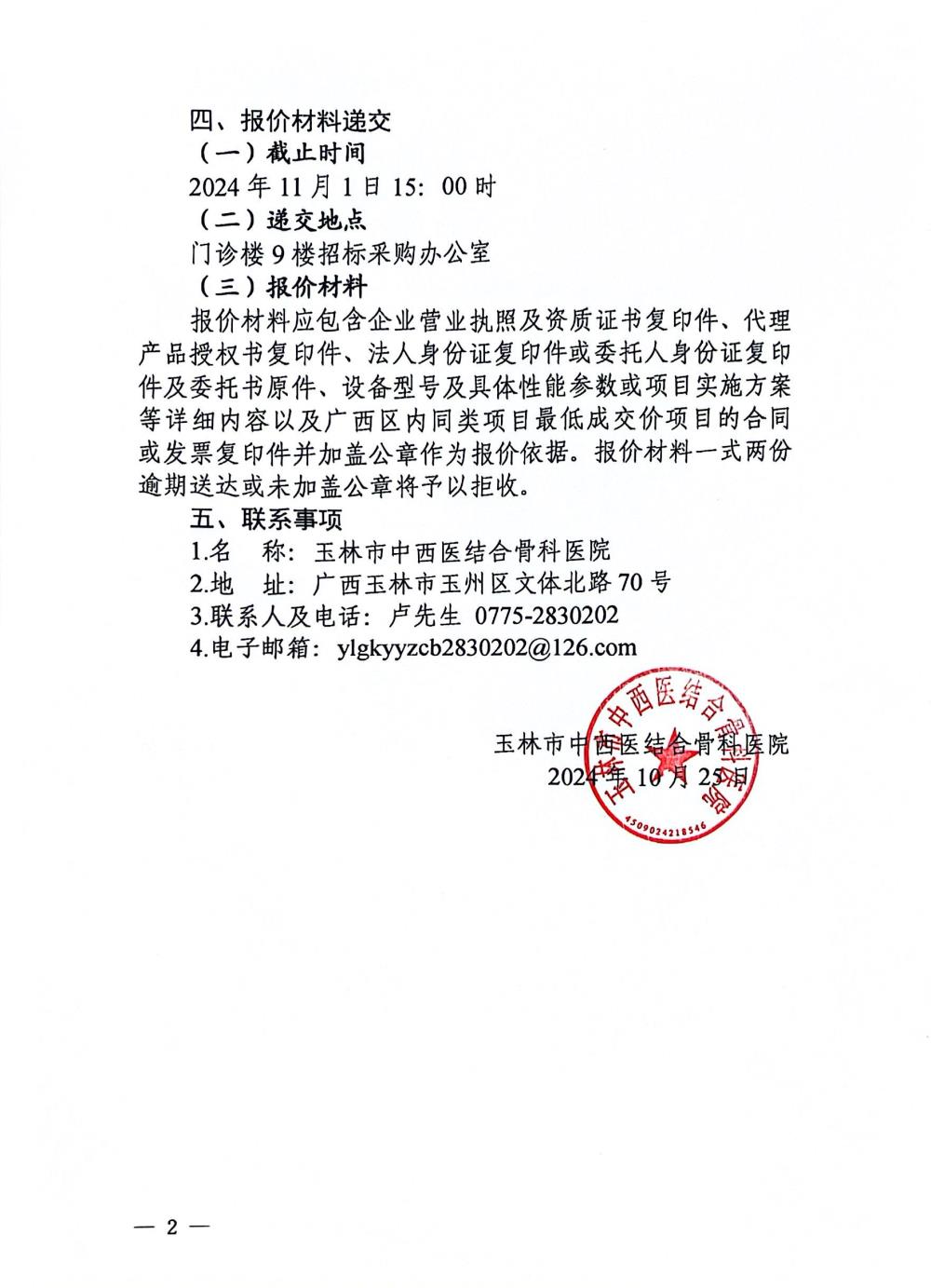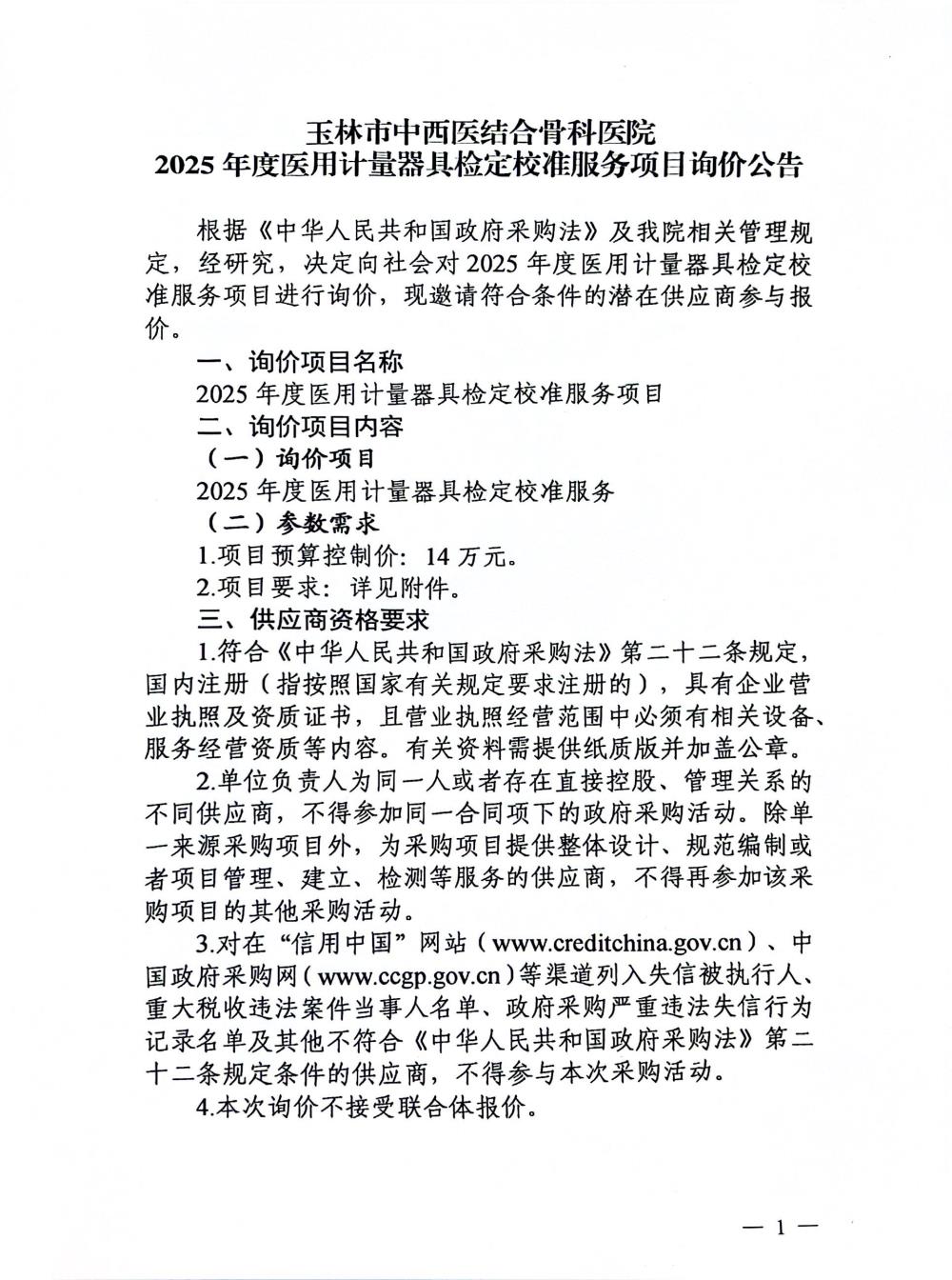 玉林市中西医结合骨科医院2025年度医用计量器具检定校准服务项目询价公告