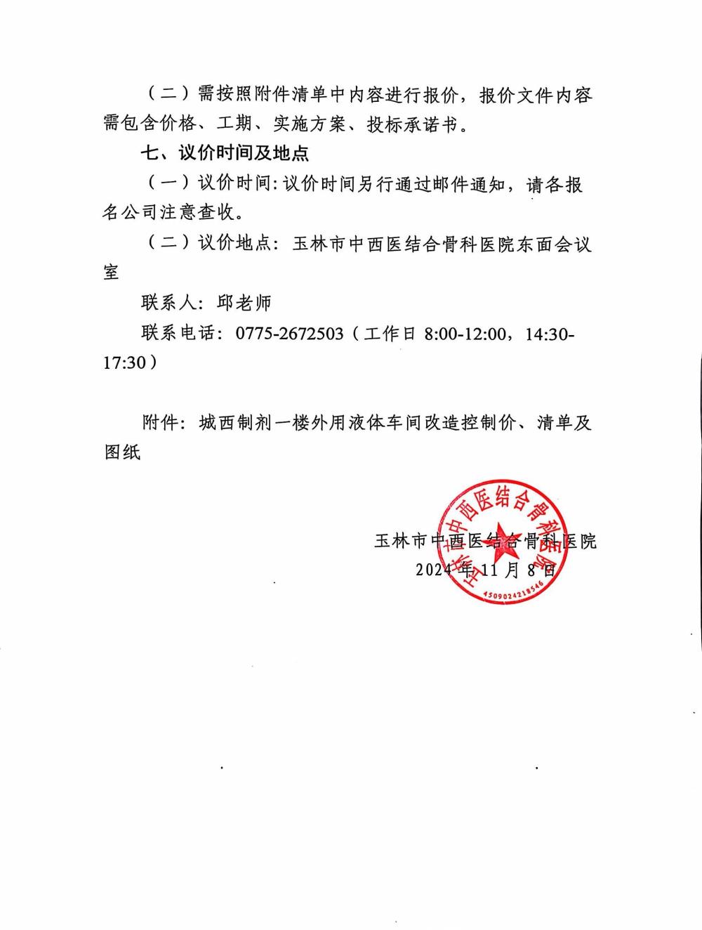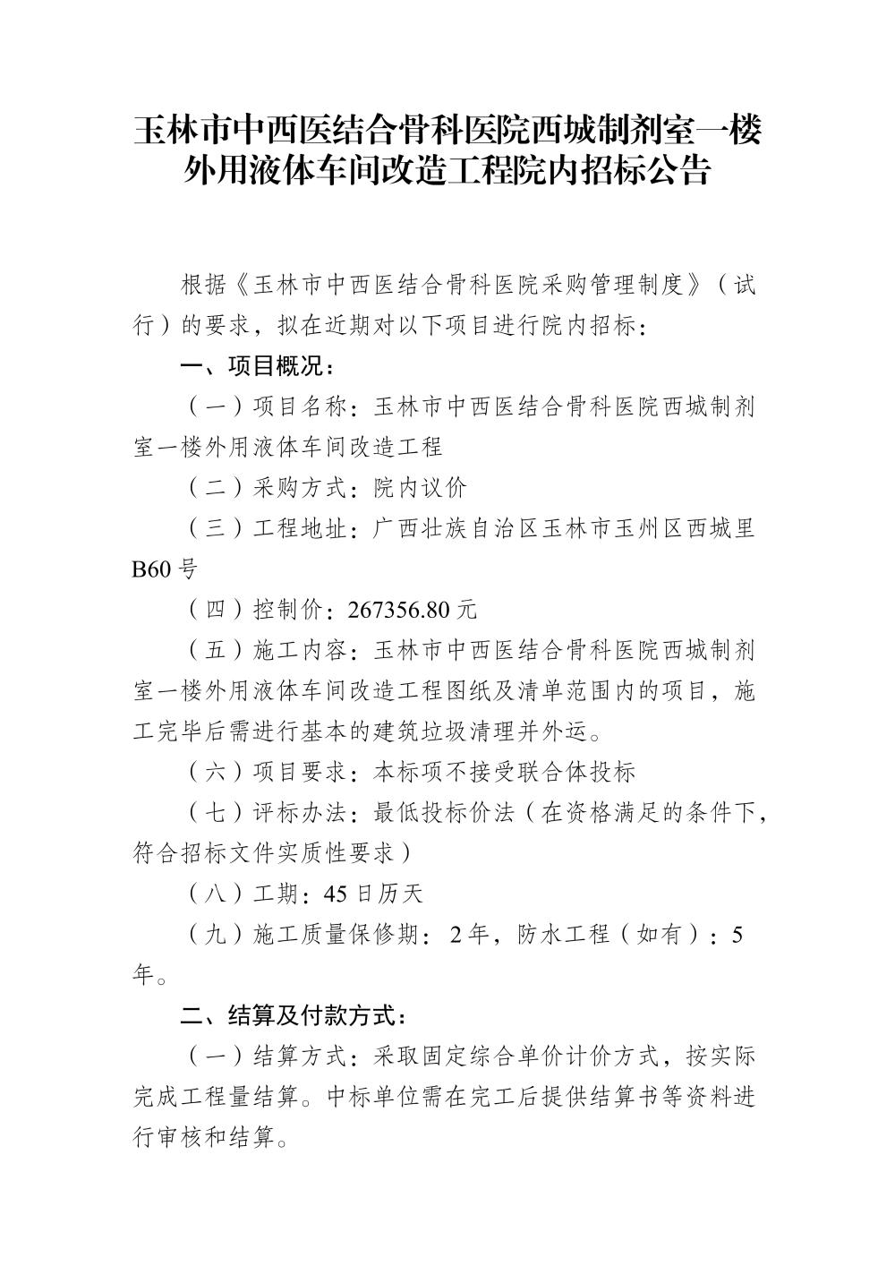 玉林市中西医结合骨科医院西城制剂室一楼外用液体车间改造工程院内招标公告