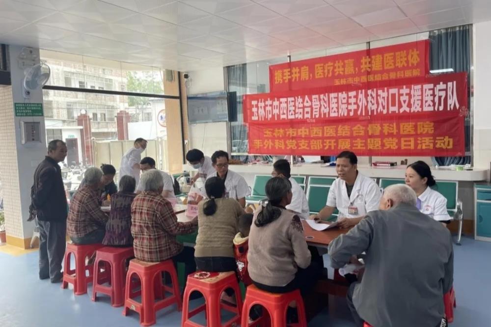 为贯彻国家医改精神、推进三甲医院带动基层的服务模式,充分发挥玉林市中西医结合骨科医院技术辐射作用,提升基层卫生人才队伍综合素质,促进基层医院卫生健康事业的发展,让中医药的智慧和服务惠及广大人民群众。近日,玉林市中西医结合骨科医院手外科党支部、行政一党支部、行政二党支部及医护人员前往陆川县横山镇卫生院开展“服务健康,骨科相伴”主题党日义诊及技术推广活动,发挥党建引领示范作用,方便群众就医,增强健康意识。