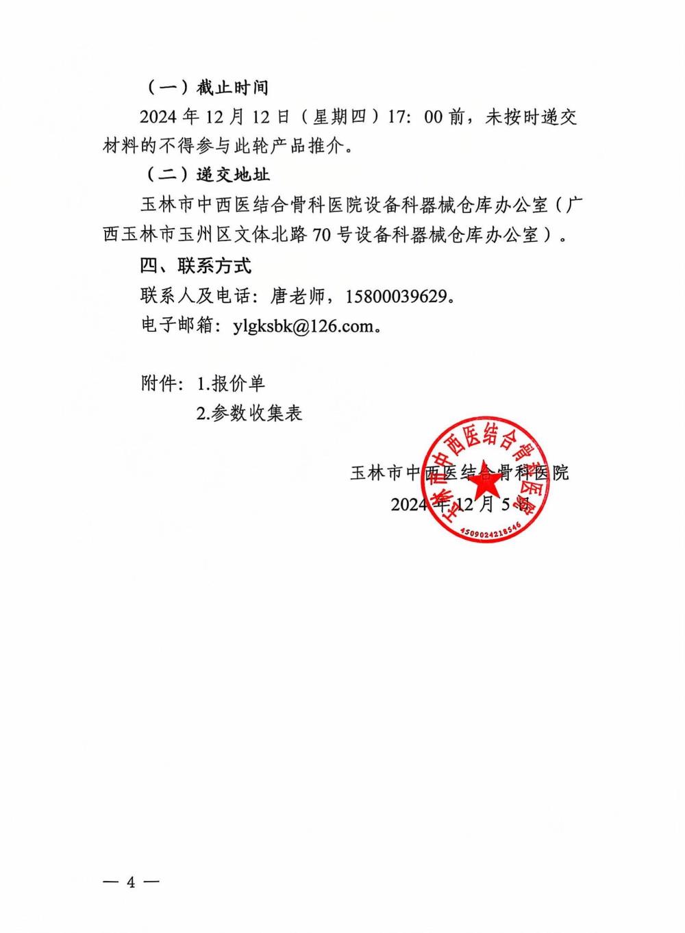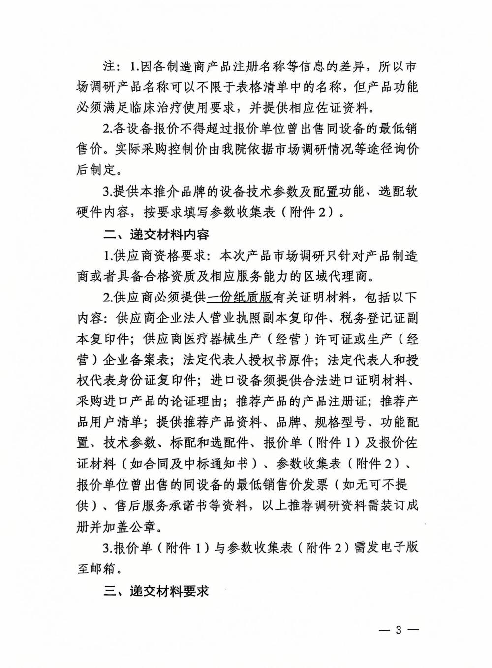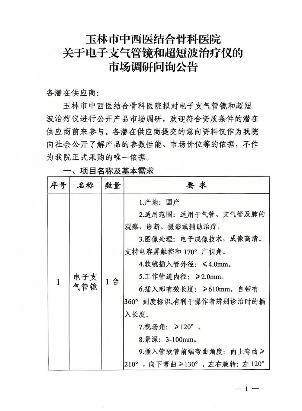 玉林市中西医结合骨科医院关于电子支气管镜和超短波治疗仪的市场调研问询公告