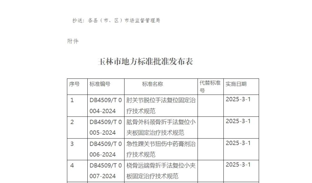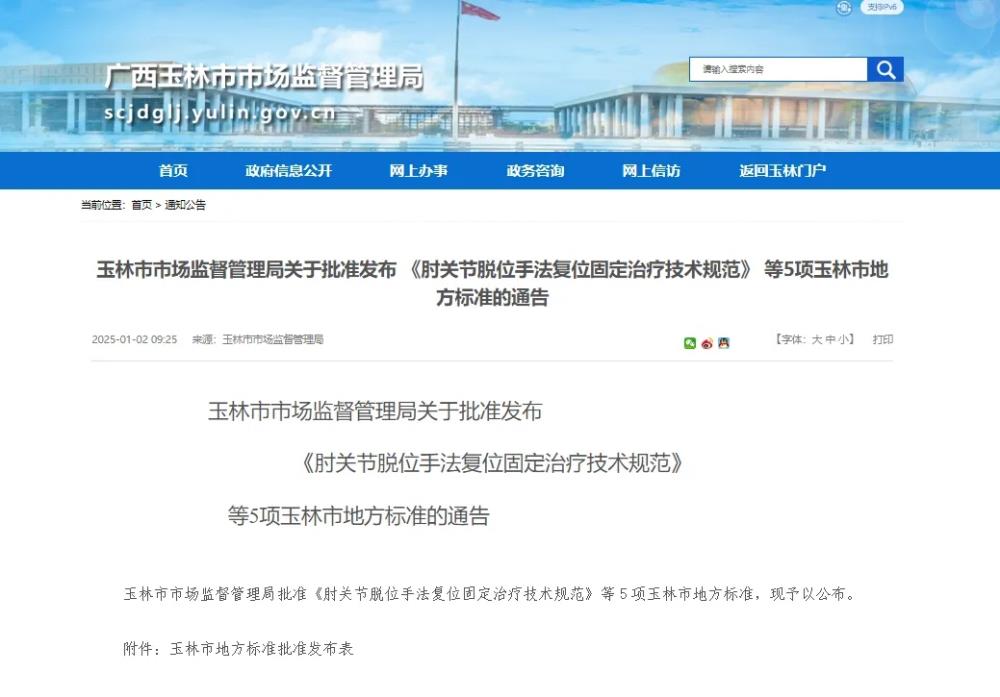 本次玉林市市场监督管理局共批准5项玉林市地方标准,我院占据了其中4项。从玉林市地方标准申请、立项到发布的近两年时间里,我院集中全院智慧筛选,整理出一批具有玉林骨伤流派特色的标准进行申报。通过公开向社会及相关单位广泛征求、收集意见,并对地方标准里的内容进行反复锤炼和优化,最终制定高质量的玉林市地方标准。该标准的实施将为医务人员在肘关节脱位手法复位固定治疗、肱骨外科颈骨折手法复位小夹板固定、急性踝关节扭伤中药膏剂治疗、桡骨远端骨折手法复位小夹板固定治疗等方面提供了诊疗技术要点,让医务人员诊疗更规范。本次临床诊疗方向的4项地方标准制定使骨科相关疾病在诊疗过程中有所依据,对临床诊疗具有重要的指导意义,使患者得到及时、准确的治疗,并促进早日康复。