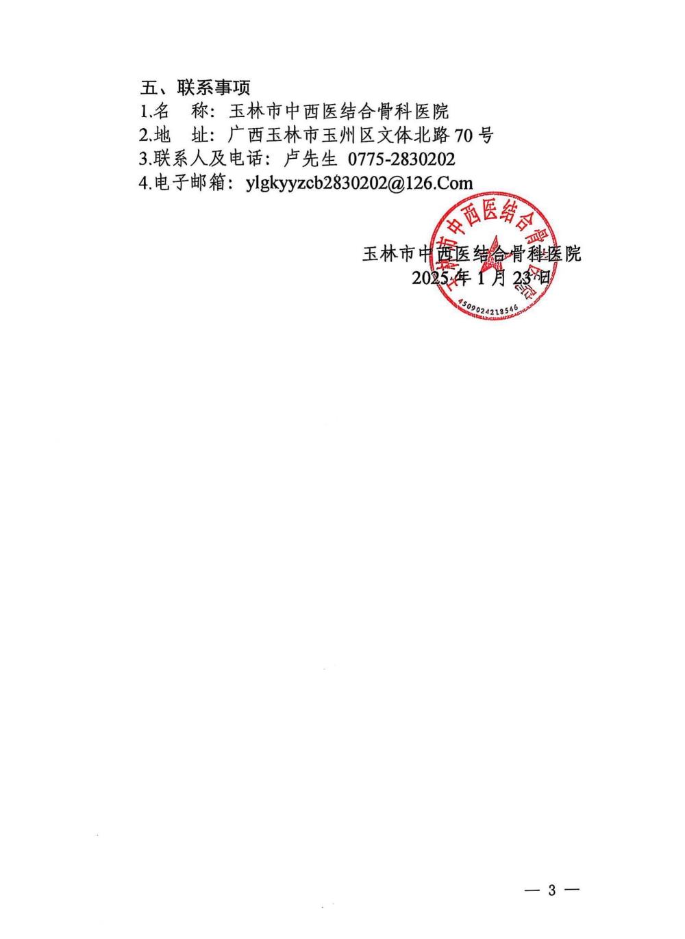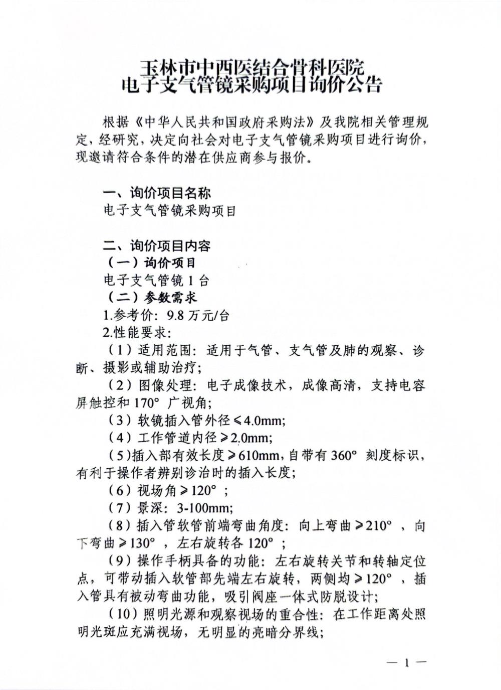 玉林市中西医结合骨科医院电子支气管镜采购项目询价公告