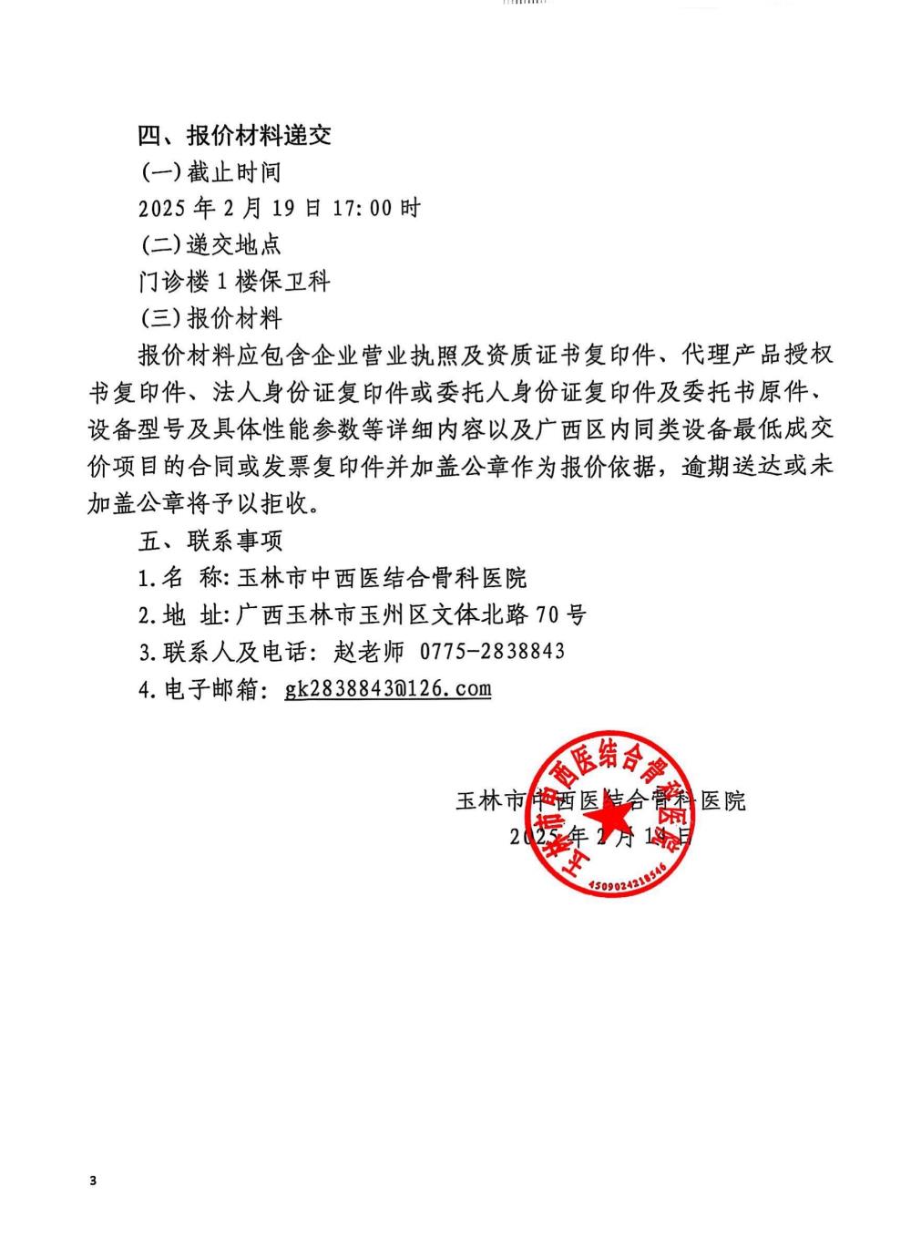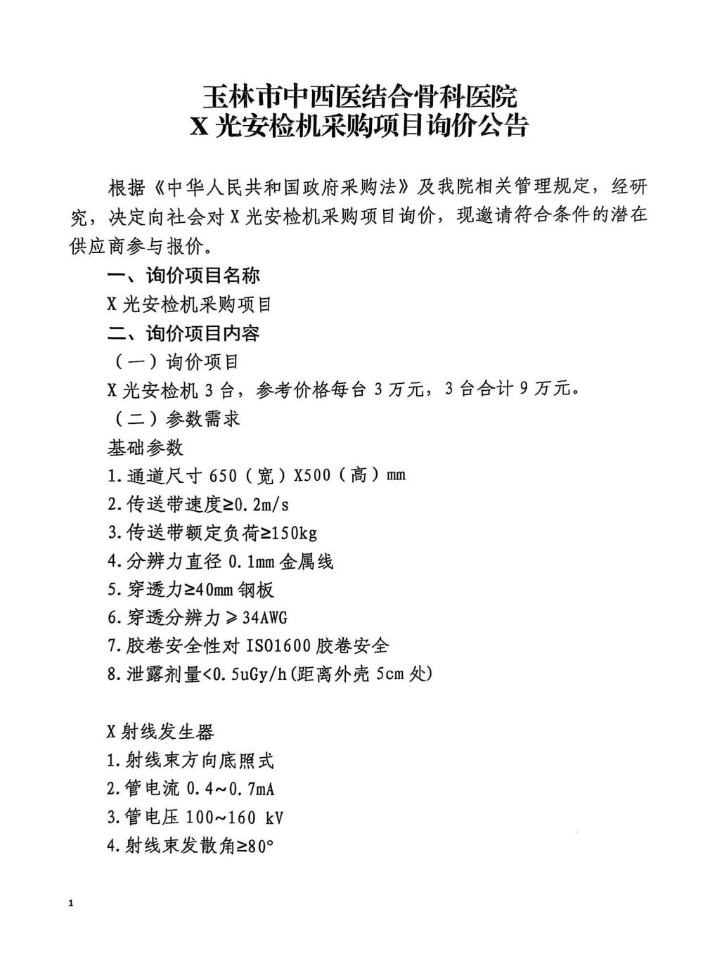 玉林市中西医结合骨科医院X光安检机采购项目询价公告