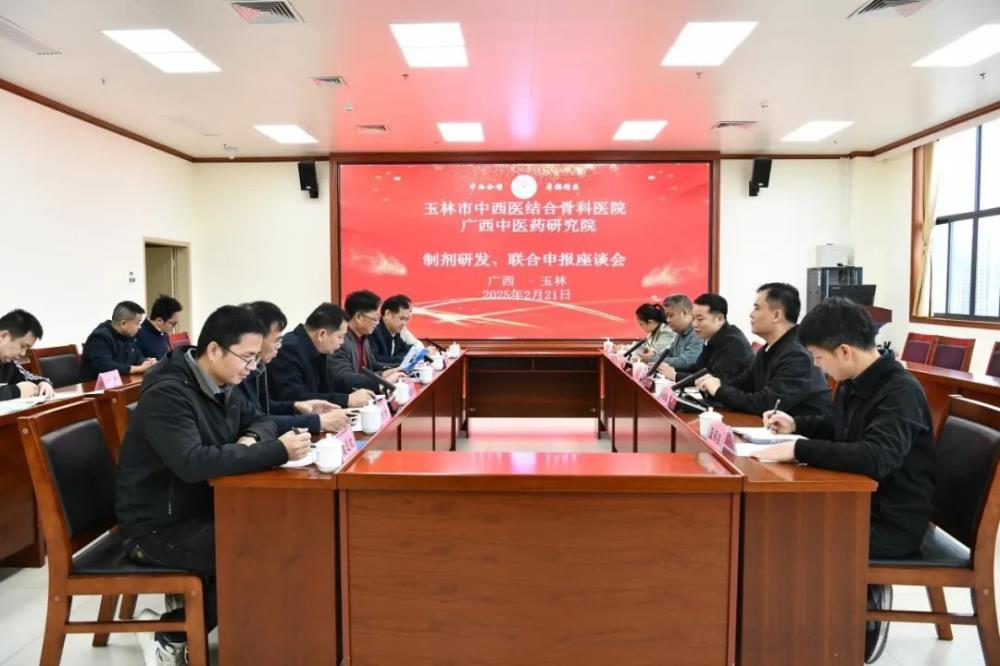 2025年2月21日上午,广西中医药研究院党委书记、院长赖克道一行莅临玉林市中西医结合骨科医院,双方就深化科技业务合作展开深入交流,旨在积极响应广西中医药壮族医药发展 “十四五” 规划要求,共同推动中医药壮瑶药的传承、创新与发展。