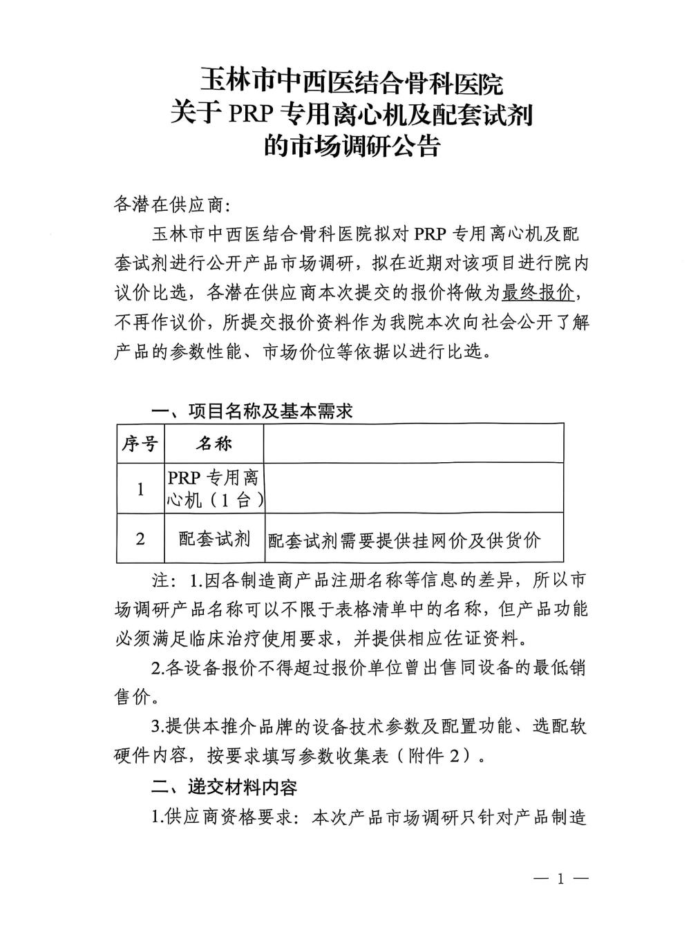 玉林市中西医结合骨科医院关于PRP专用离心机及配套试剂的市场调研公告