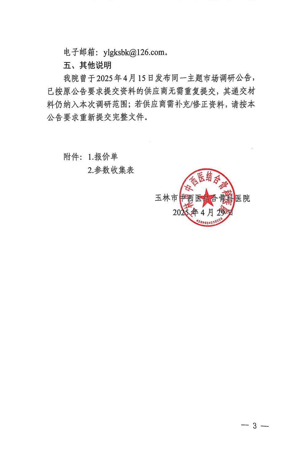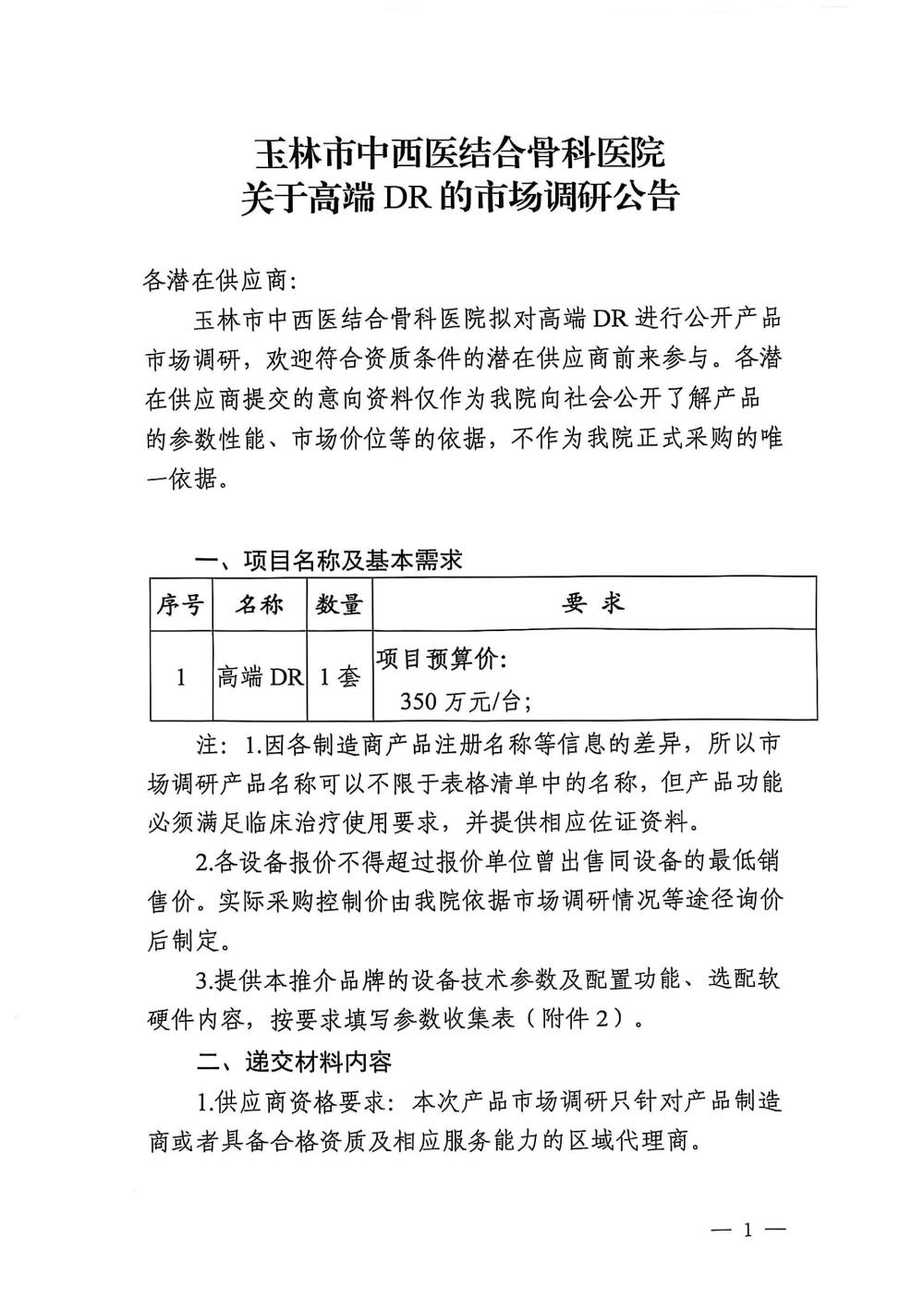 玉林市中西医结合骨科医院关于高端DR的市场调研公告