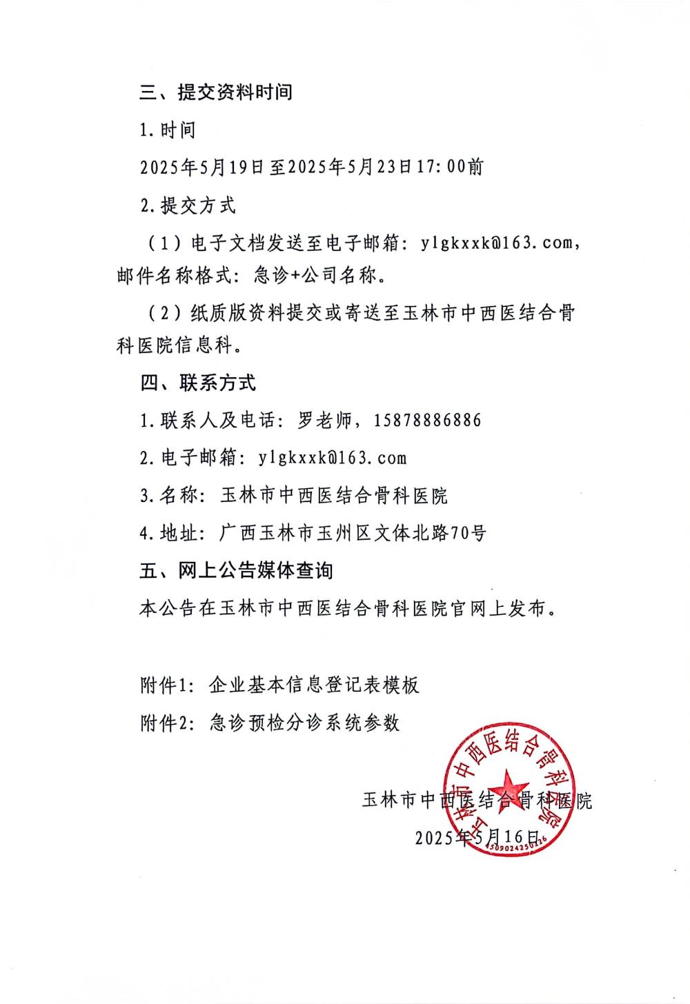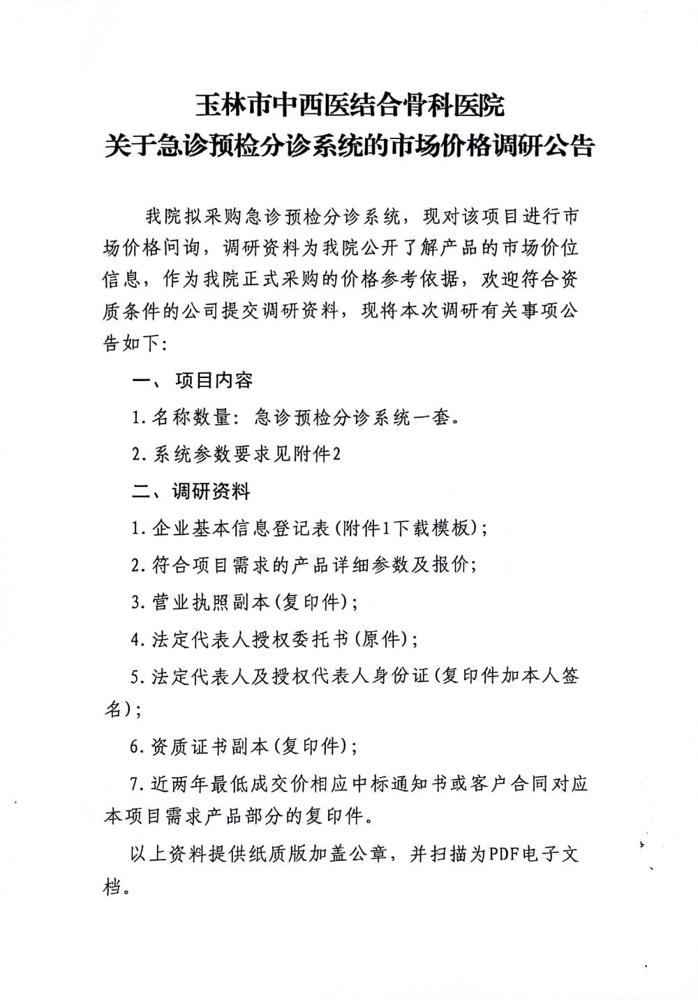 玉林市中西医结合骨科医院关于急诊预检分诊系统的市场价格调研公告