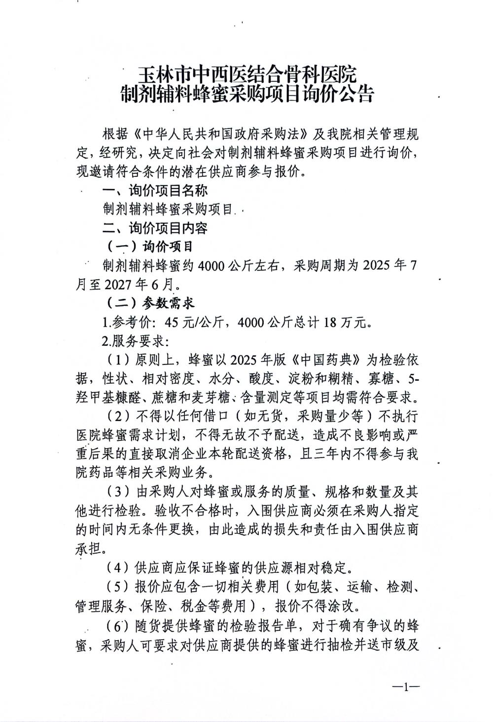 玉林市中西医结合骨科医院制剂辅料蜂蜜采购项目询价公告
