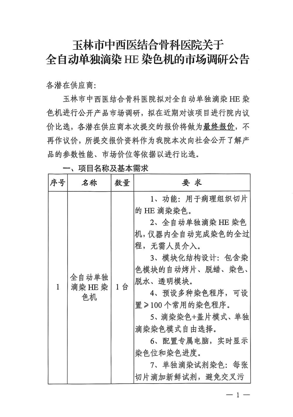 林市中西医结合骨科医院关于全自动单独滴染HE染色机的市场调研公告