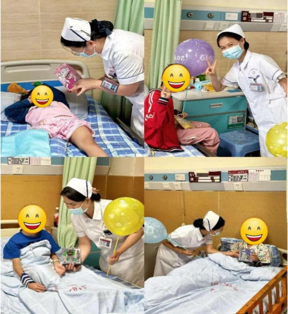 活动当天,护士们面带笑容,捧着礼物走进病房。孩子们看到礼物时,脸上瞬间绽放出惊喜又灿烂的笑容。有的迫不及待拆开包装,兴奋地与小伙伴分享喜悦;有的紧紧抱住礼物,拉着护士合影留念。一位小腿骨折的小朋友开心地说:“谢谢护士姐姐!这个变形金刚我太喜欢了!虽然我的腿不能动,但我可以像他一样勇敢击败病魔!” 家长们也深受感动:“没想到在医院也能给孩子过这么有意义的儿童节,看到孩子这么开心,我们心里也暖暖的,太感谢你们了!”