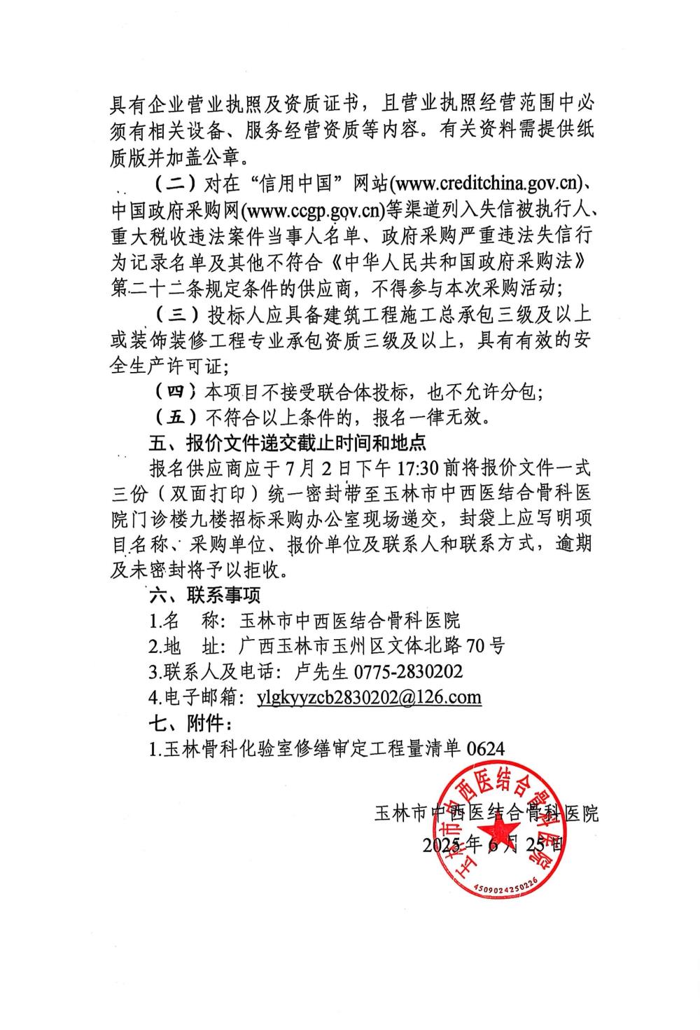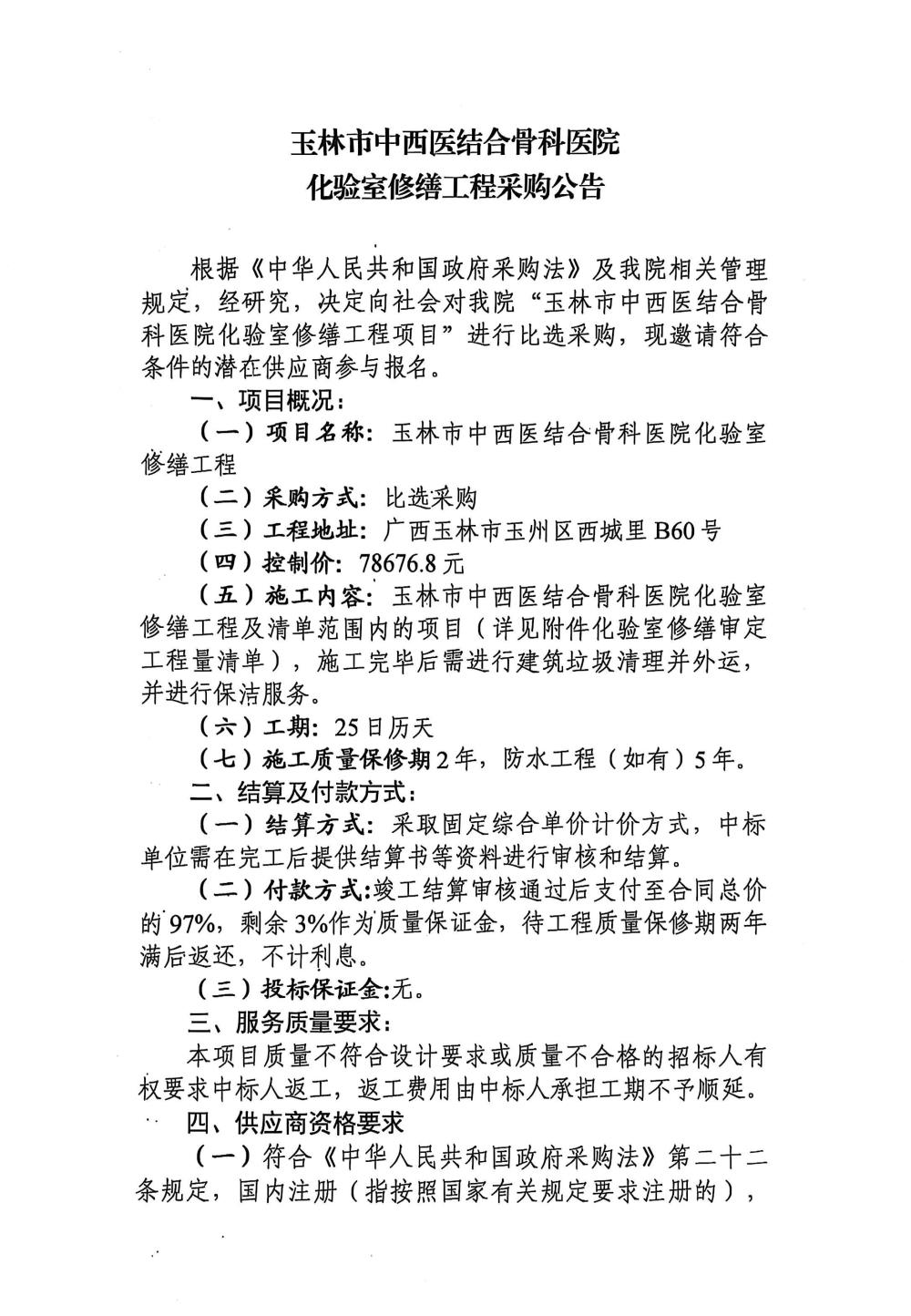 玉林市中西医结合骨科医院化验室修缮工程采购公告