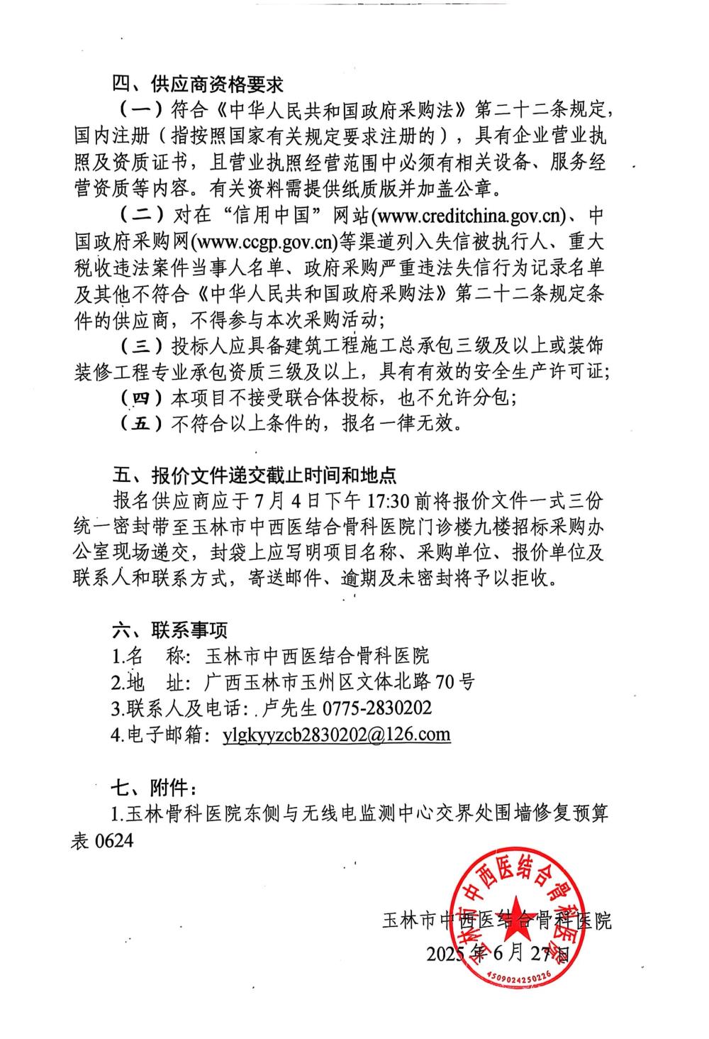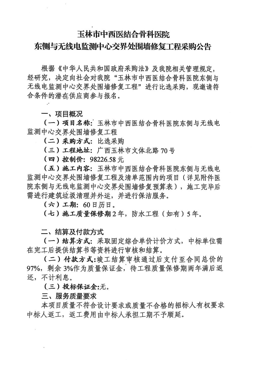 玉林市中西医结合骨科医院东侧与无线电监测中心交界处围墙修复工程采购公告