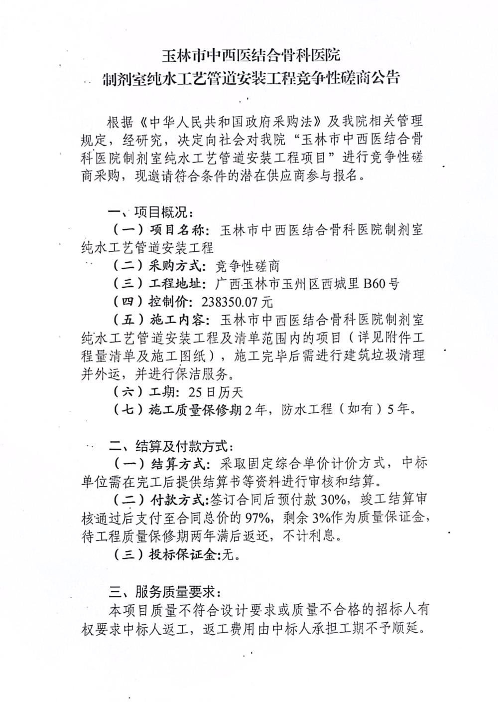 玉林市中西医结合骨科医院制剂室纯水工艺管道安装工程竞争性磋商公告