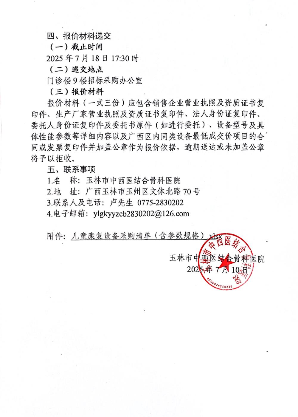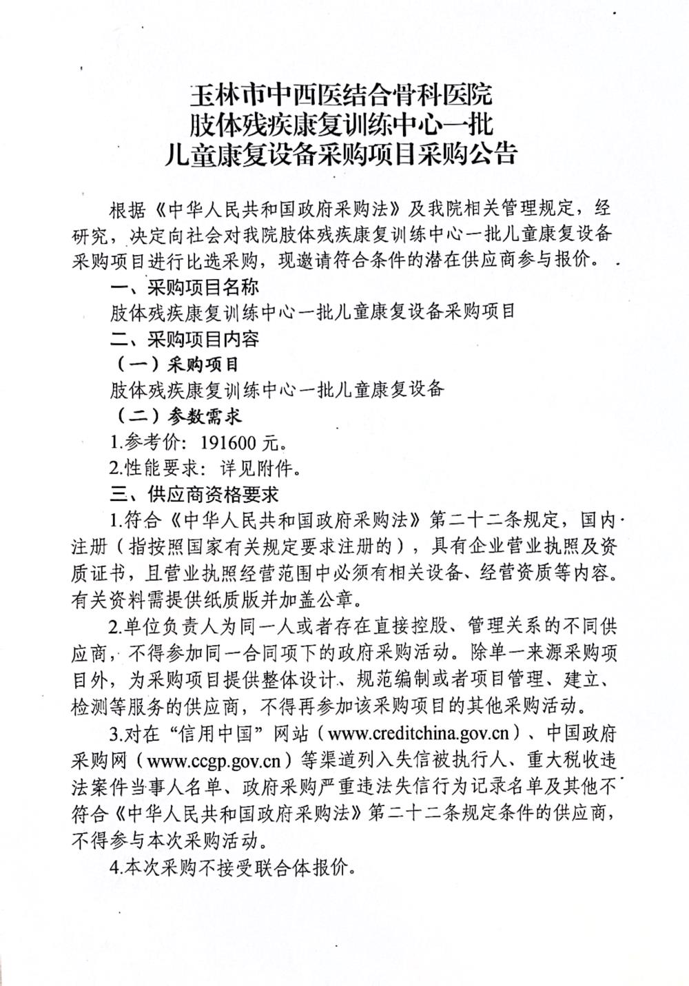 玉林市中西医结合骨科医院肢体残疾康复训练中心一批儿童康复设备采购项目采购公告