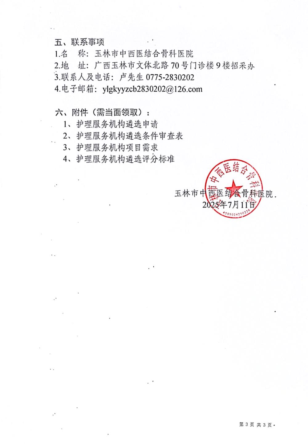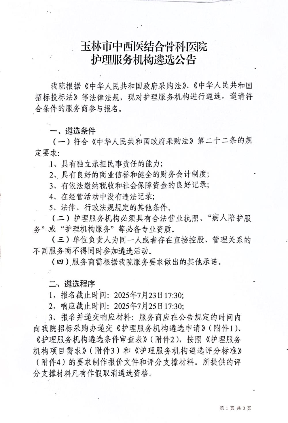 玉林市中西医结合骨科医院护理服务机构遴选公告