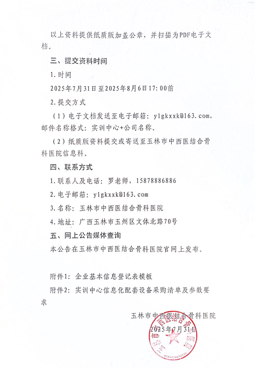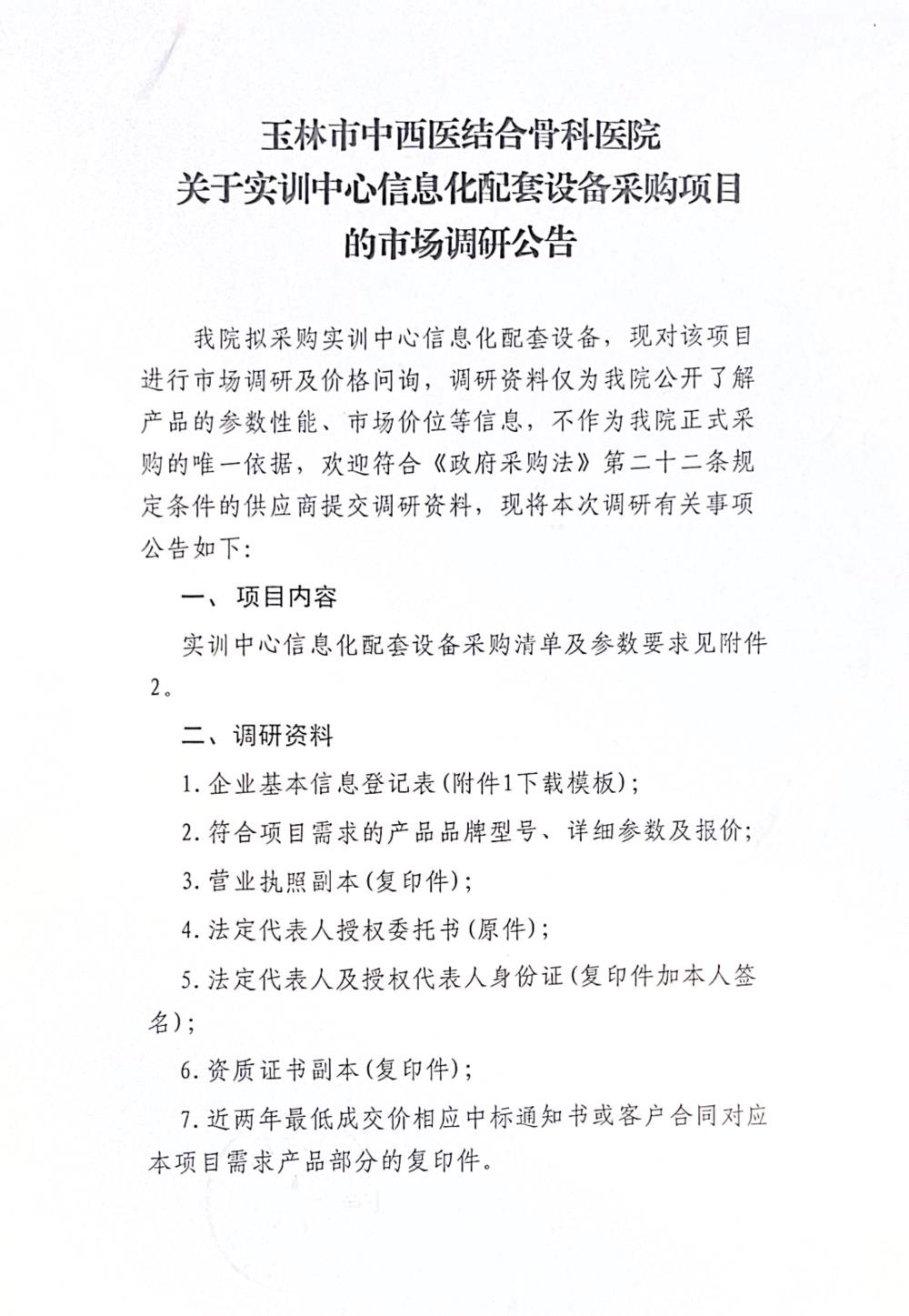 玉林市中西医结合骨科医院关于实训中心信息化配套设备采购项目的市场调研公告