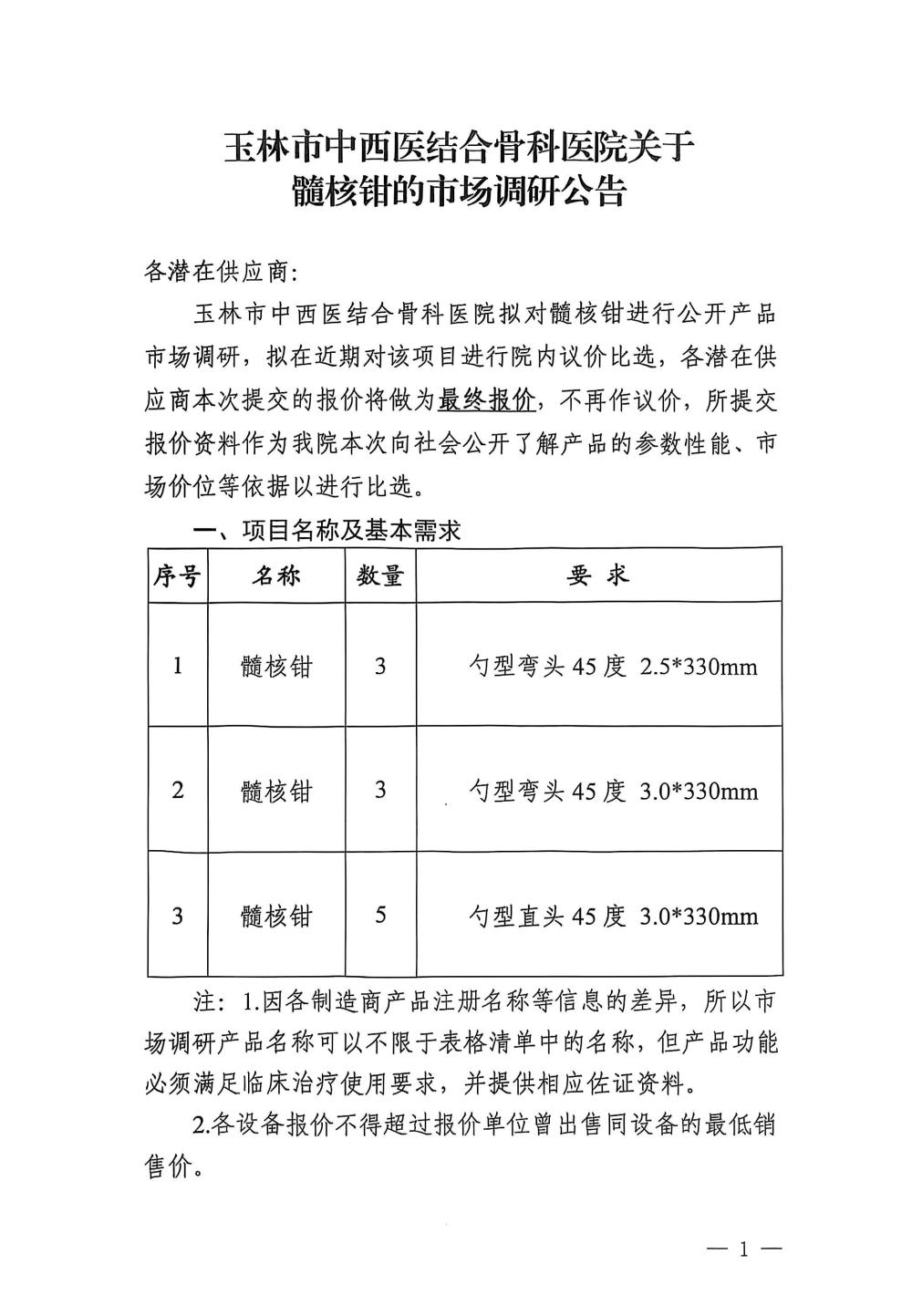 玉林市中西医结合骨科医院关于髓核钳的市场调研公告
