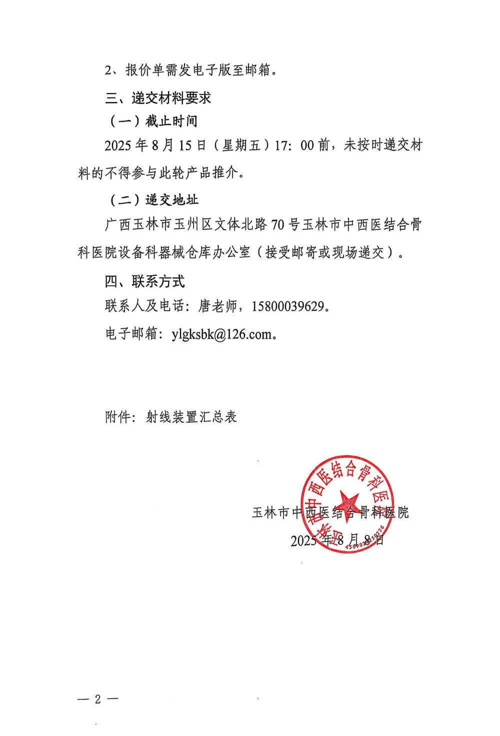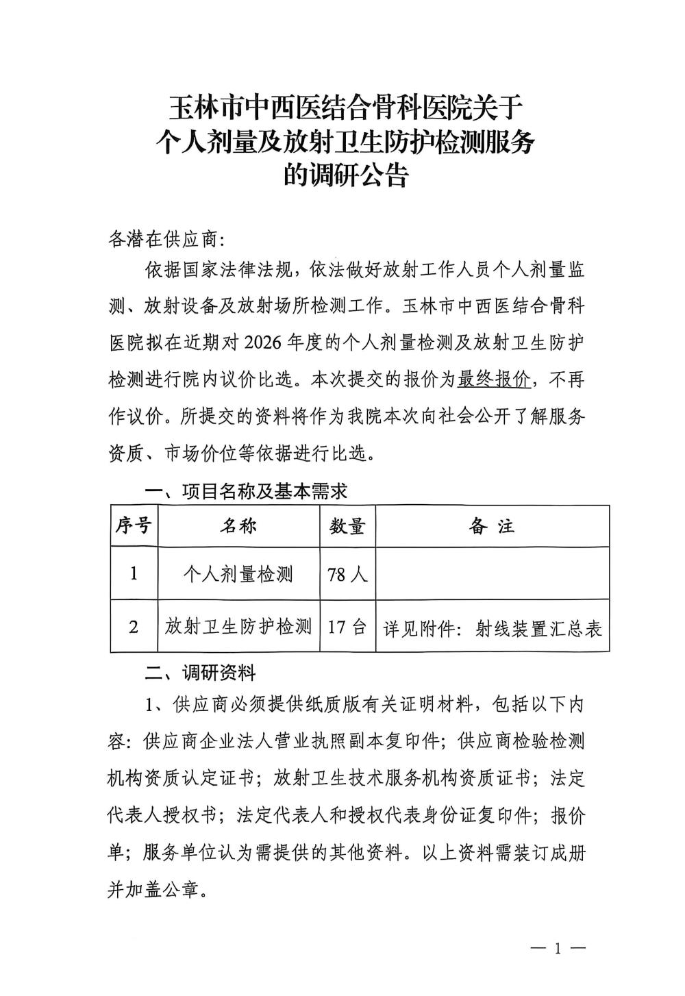 玉林市中西医结合骨科医院关于个人剂量及放射卫生防护检测服务的调研公告