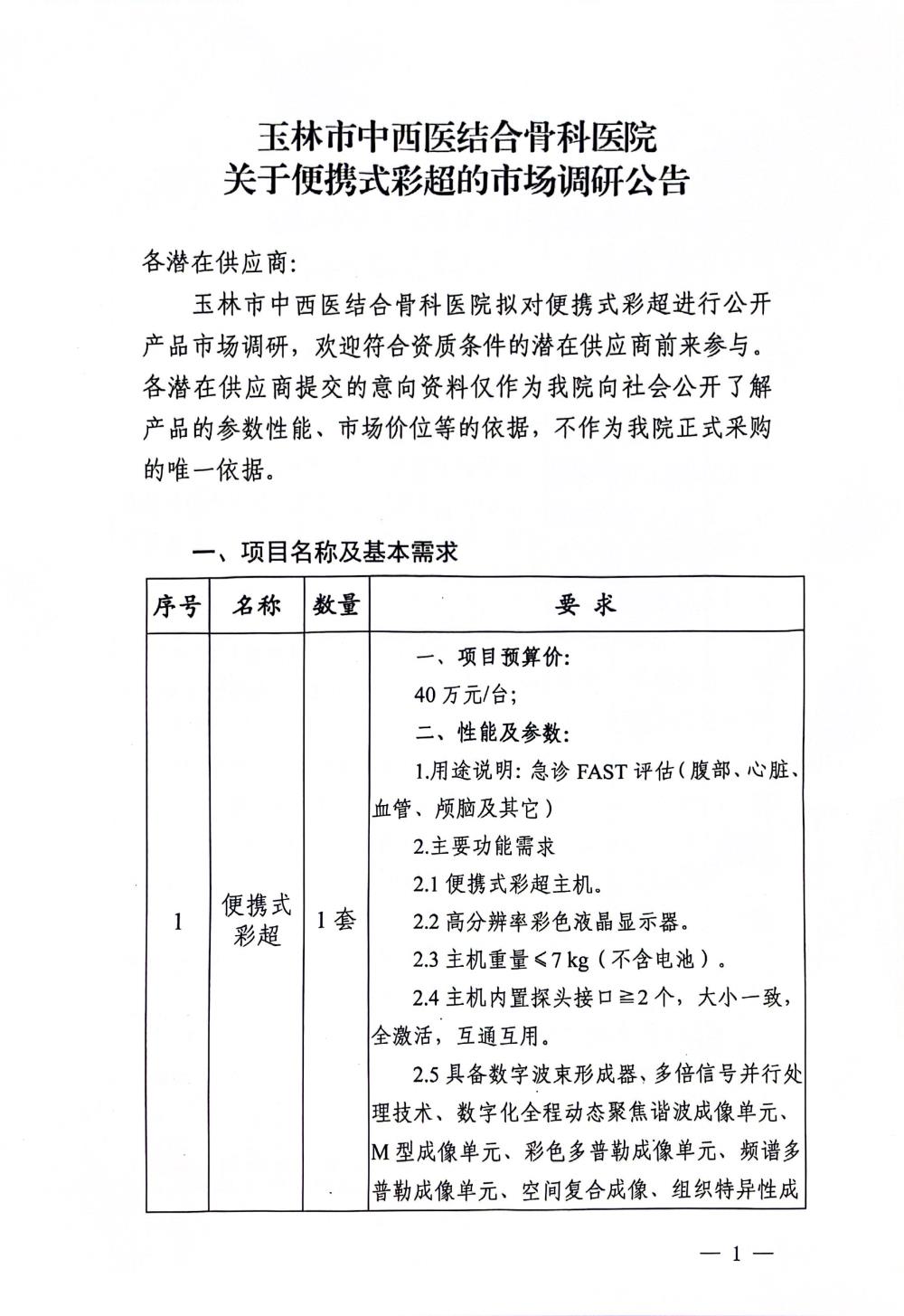 玉林市中西医结合骨科医院关于便携式彩超的市场调研公告