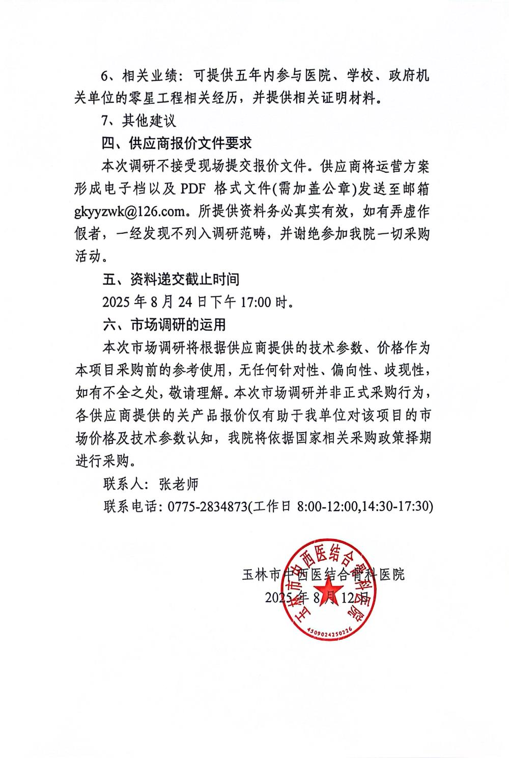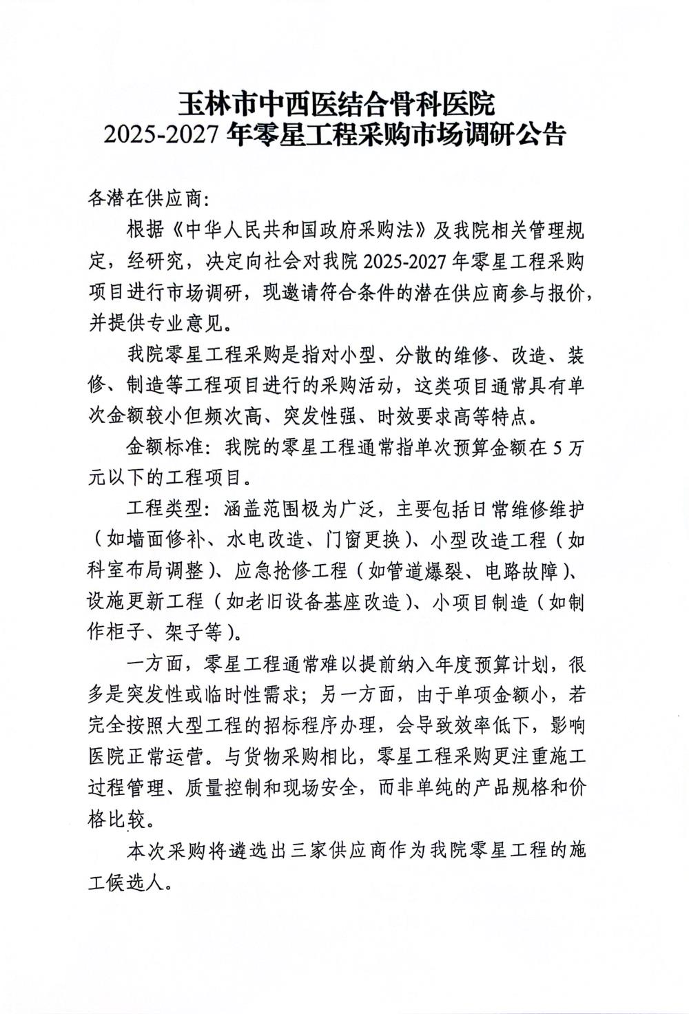 玉林市中西医结合骨科医院2025-2027年零星工程采购市场调研公告