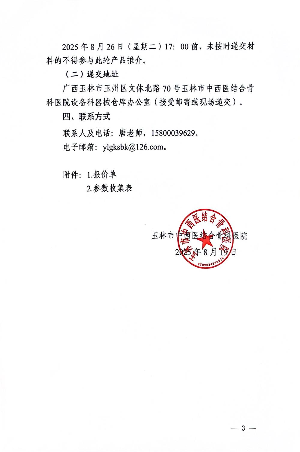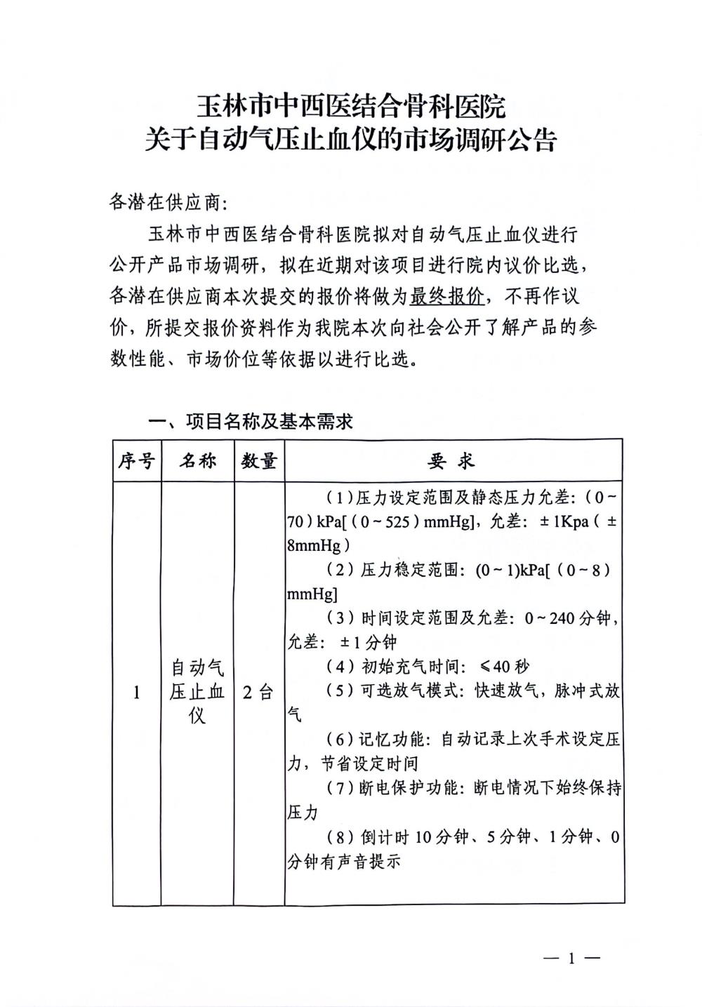 玉林市中西医结合骨科医院关于自动气压止血仪的市场调研公告
