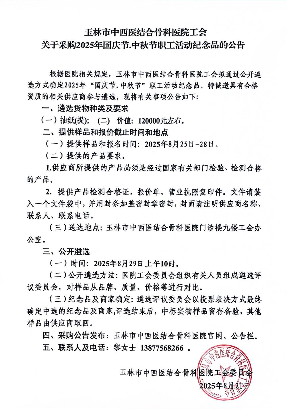 玉林市中西医结合骨科医院工会关于采购2025年国庆节.中秋节职工活动纪念品的公告