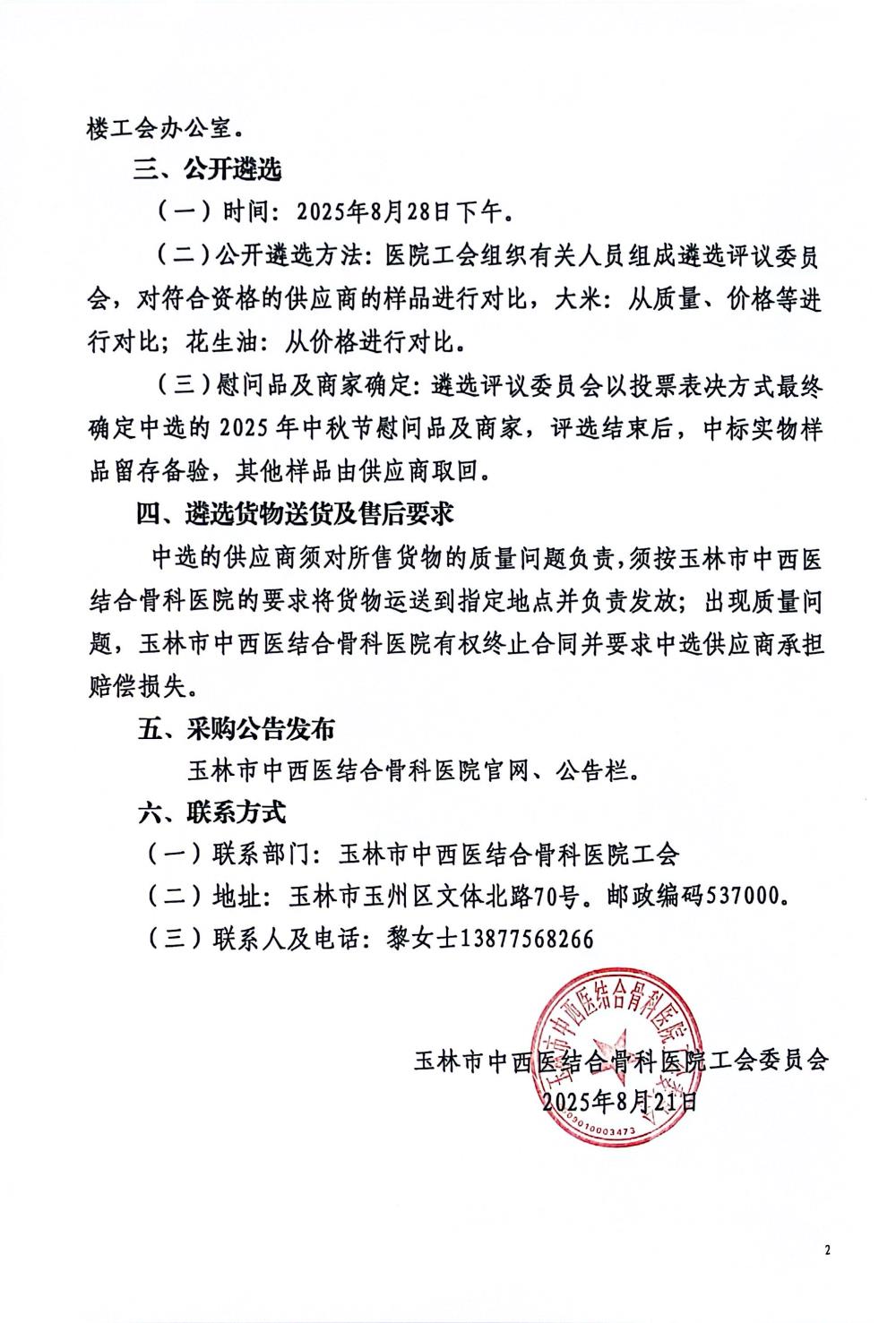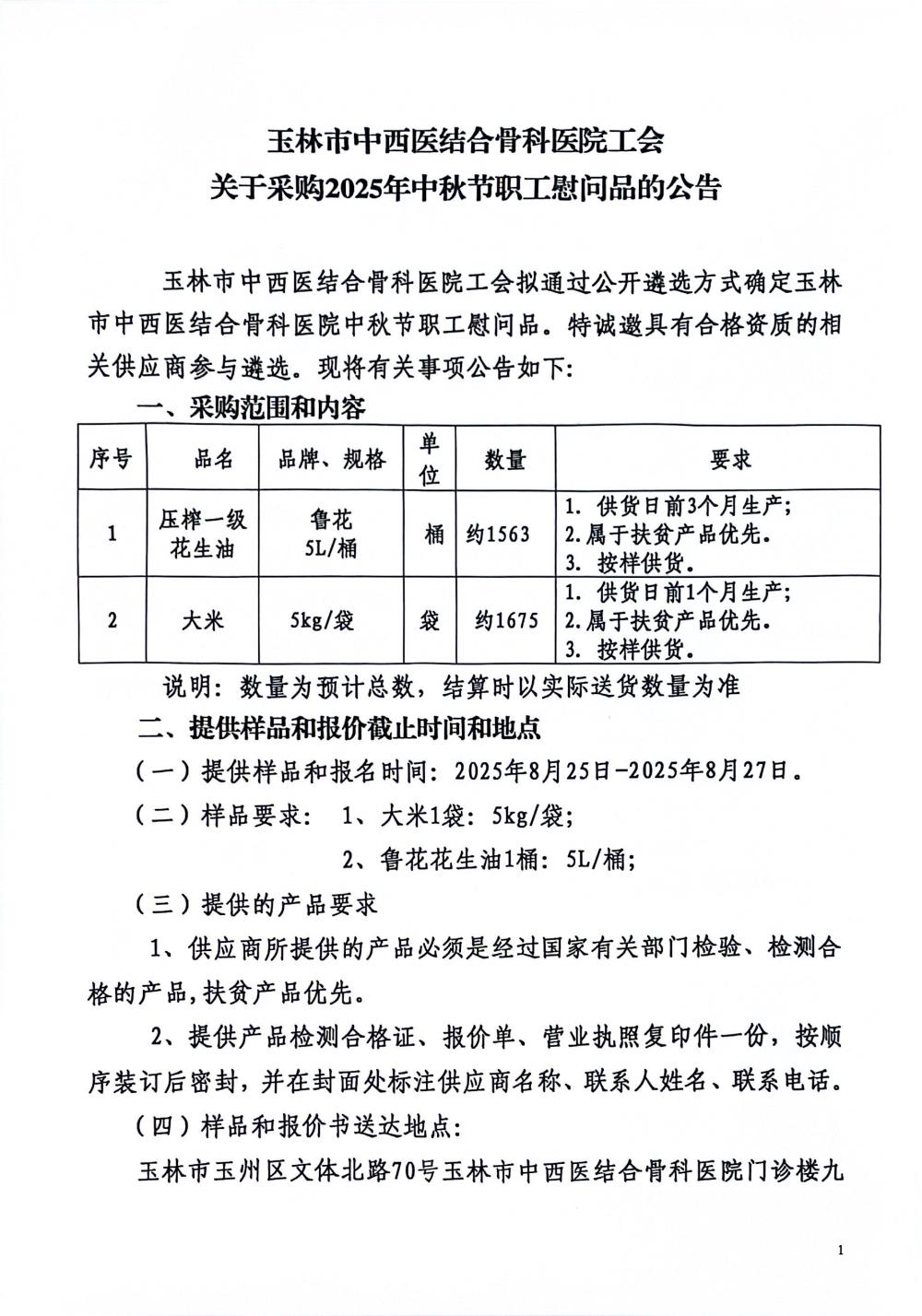 玉林市中西医结合骨科医院工会关于采购2025年中秋节职工慰问品的公告