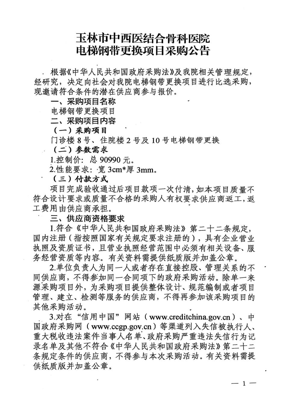 玉林市中西医结合骨科医院电梯钢带更换项目采购公告