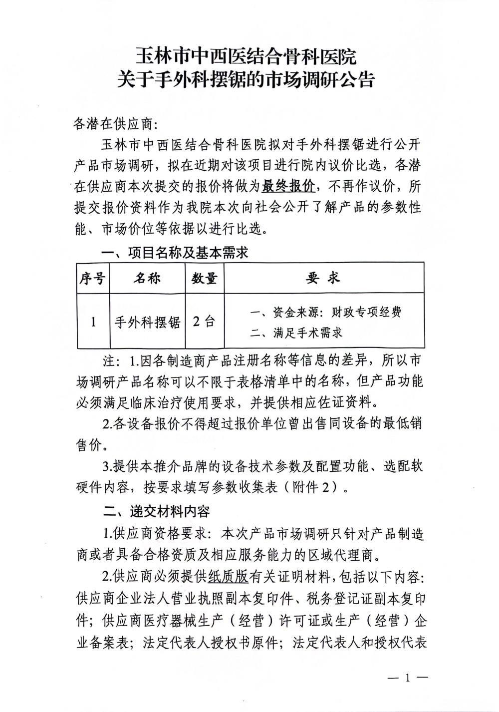 玉林市中西医结合骨科医院关于手外科摆锯的市场调研公告