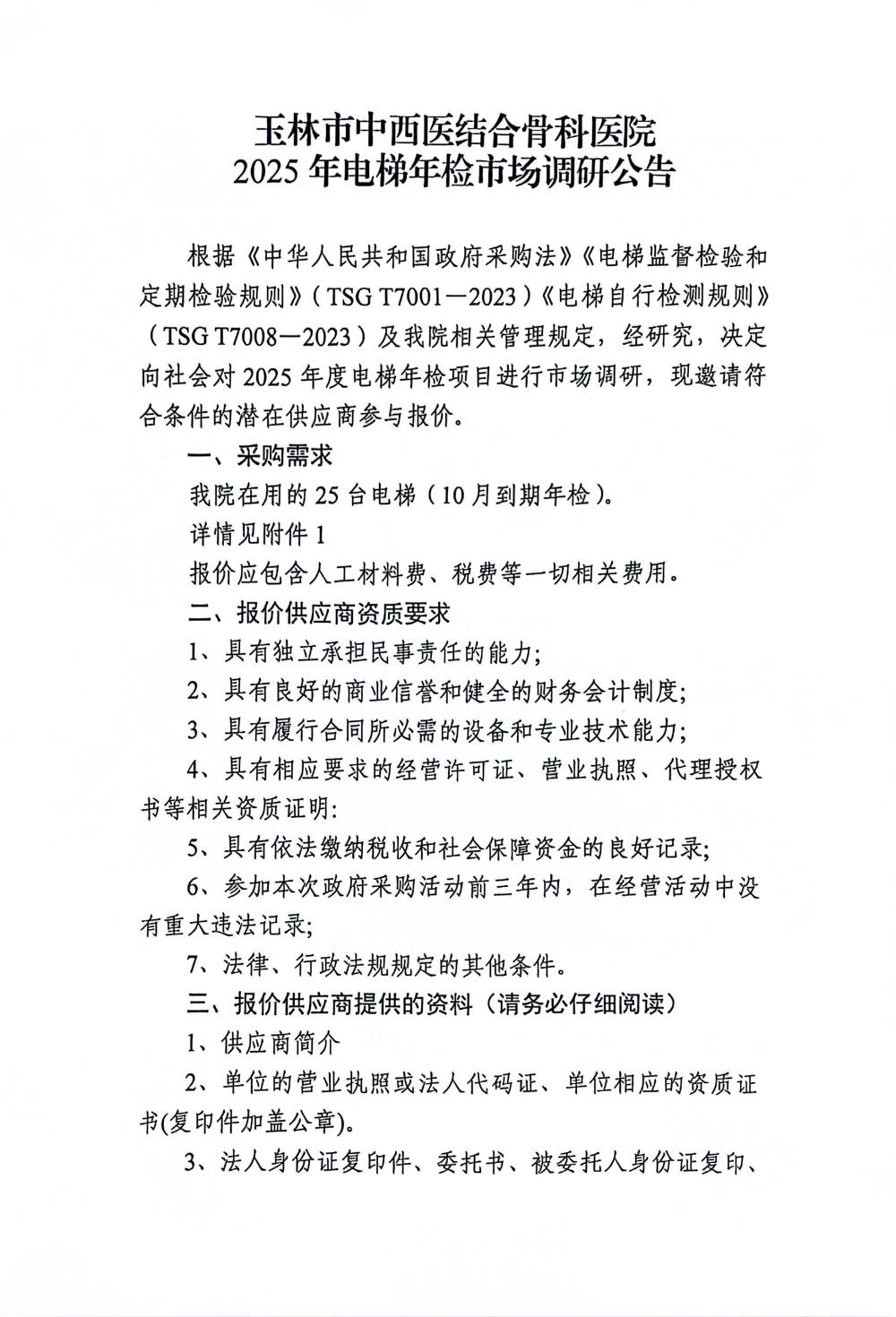 玉林市中西医结合骨科医院2025年电梯年检市场调研公告