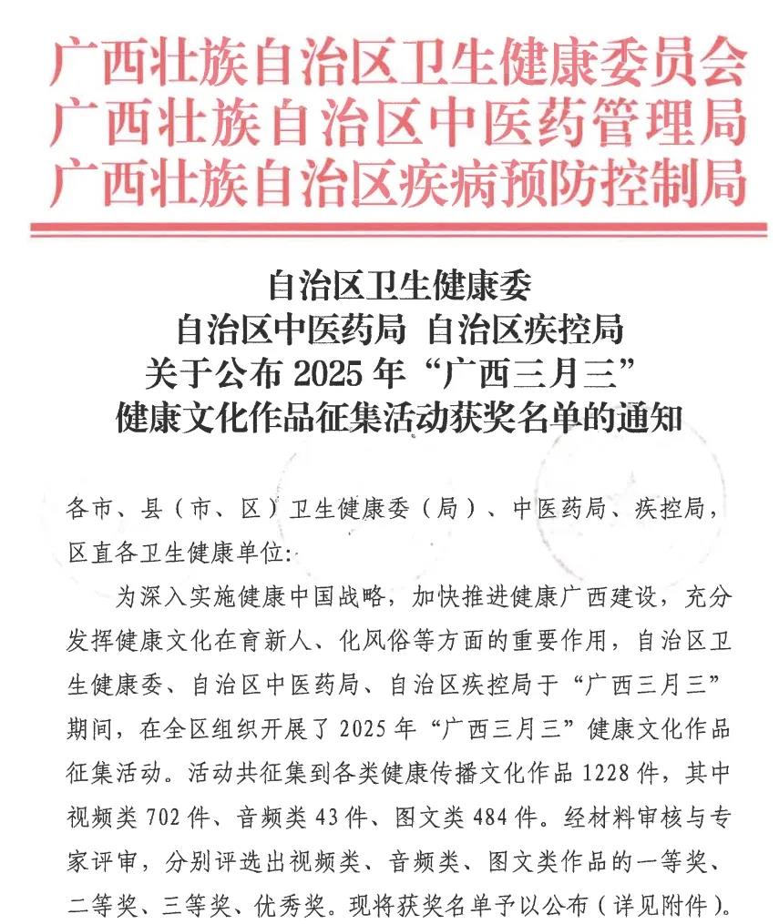 在广西壮族自治区卫生健康委员会、中医药管理局、疾病预防控制局主办的2025年“广西三月三”健康文化作品征集活动中,由黄园园、梁波、吕燕、唐艳、苏珊、陈蓉、余海玲、张宝文共同完成创作的科普作品《一叶知千年——艾草》凭借专业的医学内涵、创新的表达方式以及深厚的中医药文化底蕴,从1228件参赛作品中脱颖而出,荣获一等奖!