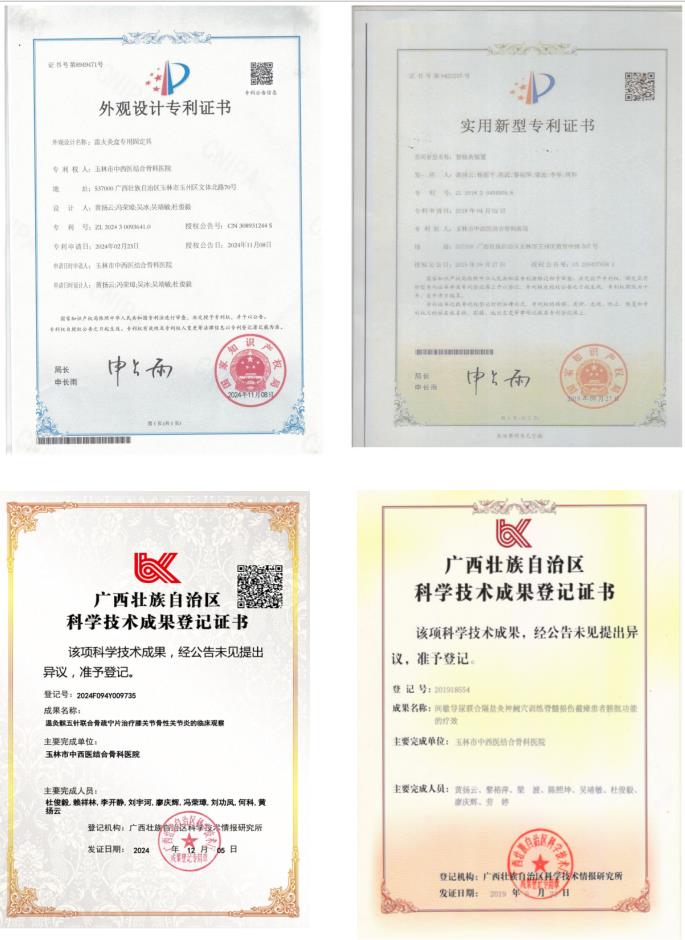 3、广西壮族自治区科技成果登记《温灸髌五针联合骨疏宁治疗膝关节骨性关节炎的临床观察》,登记号:2024F094Y009735;