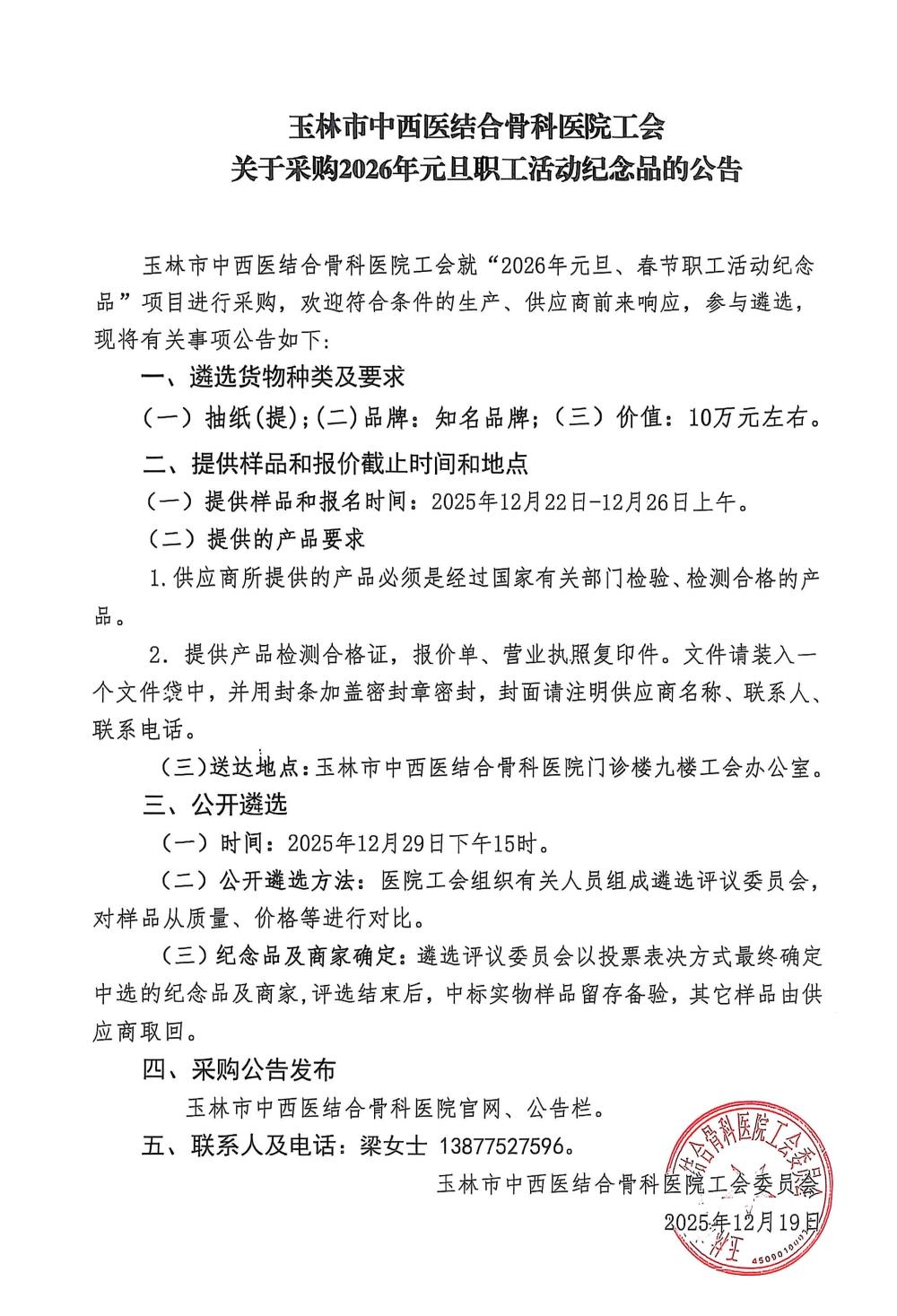 玉林市中西医结合骨科医院工会关于采购2026年元旦职工活动纪念品的公告