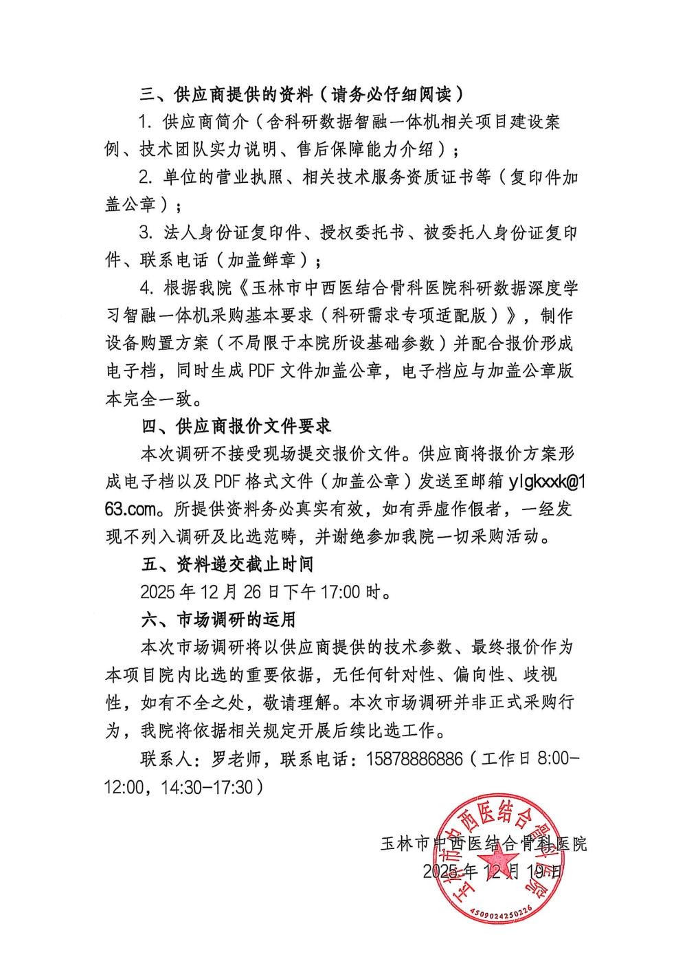 《玉林市中西医结合骨科医院科研数据深度学习智融一体机》购置项目市场调研公告