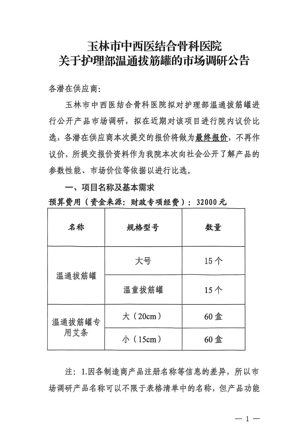 玉林市中西医结合骨科医院关于护理部温通拔筋罐的市场调研公告