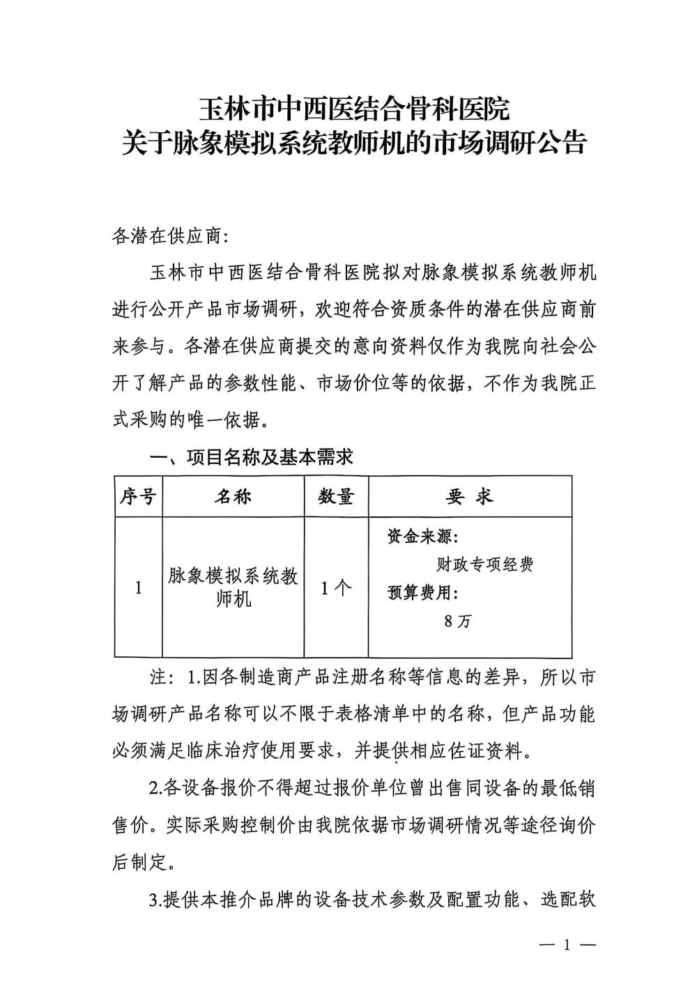 玉林市中西医结合骨科医院关于脉象模拟系统教师机的市场调研公告