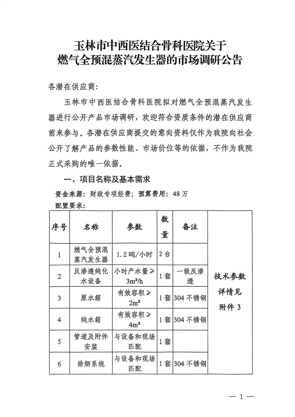 玉林市中西医结合骨科医院关于燃气全预混蒸汽发生器的市场调研公告