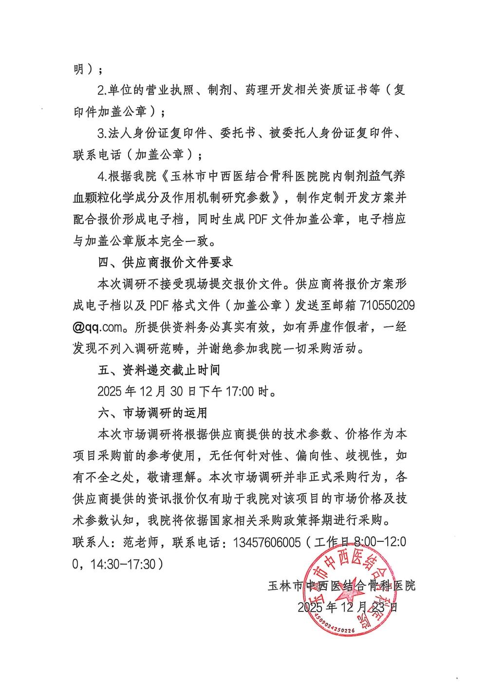 《玉林市中西医结合骨科医院院内制剂益气养血颗粒化学成分及作用机制研究》开发项目市场调研公告