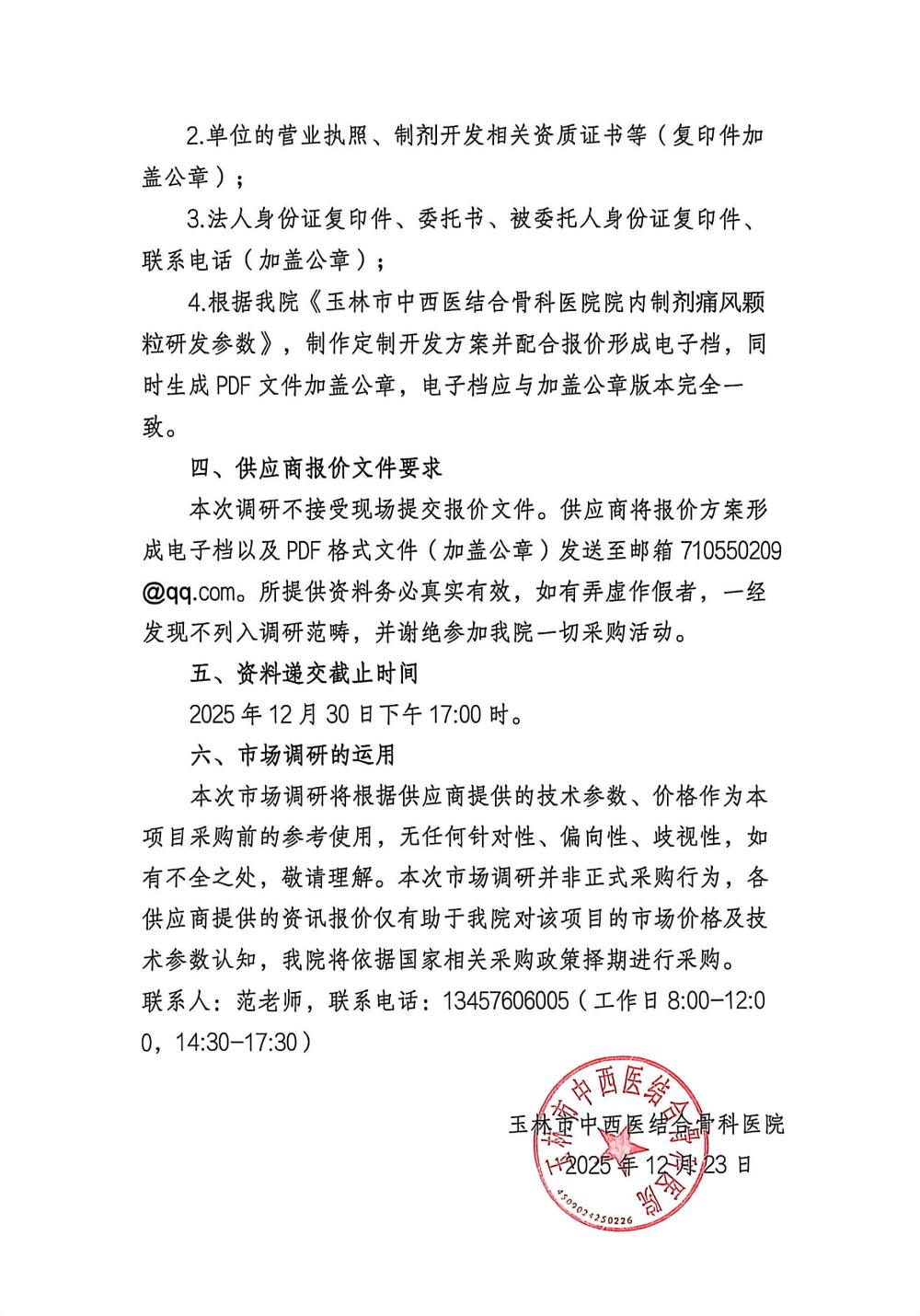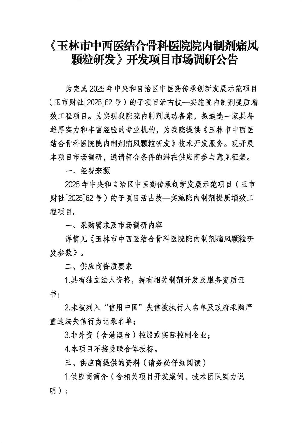 《玉林市中西医结合骨科医院院内制剂痛风颗粒研发》开发项目市场调研公告