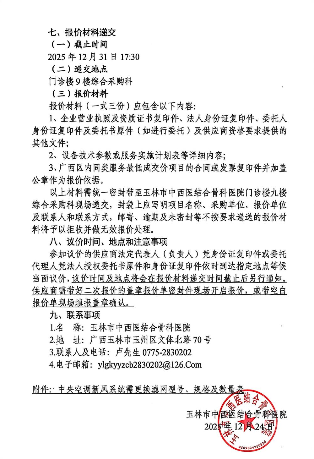 玉林市中西医结合骨科医院中央空调新风系统滤网更换服务项目采购公告
