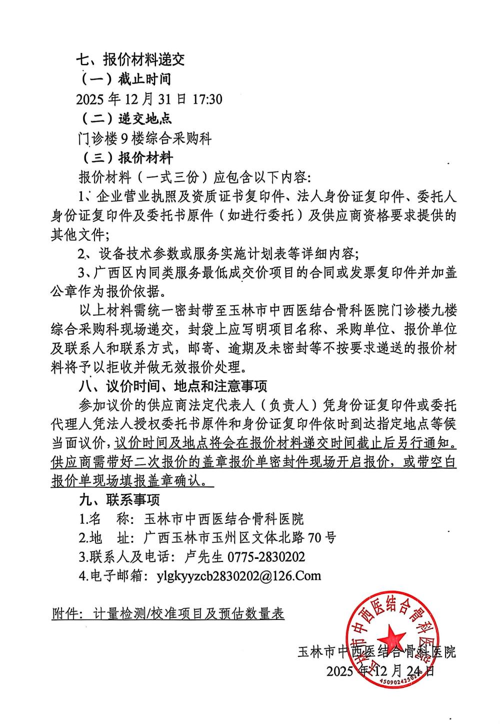 玉林市中西医结合骨科医院计量器具检测服务项目采购公告