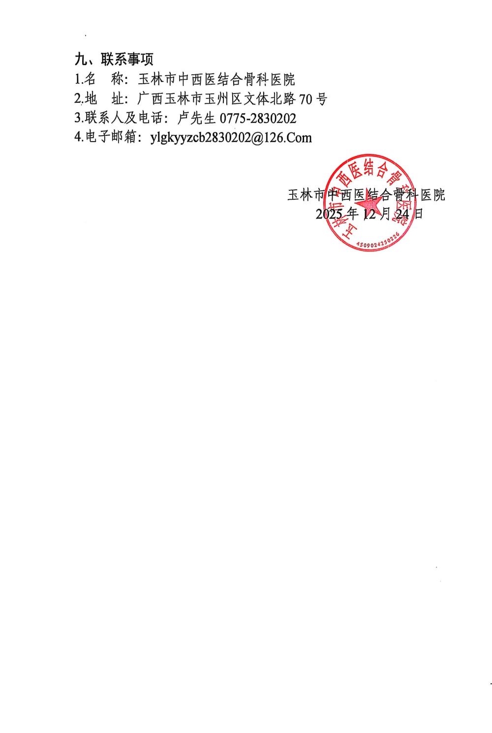 玉林市中西医结合骨科医院计量器具检测服务项目采购公告