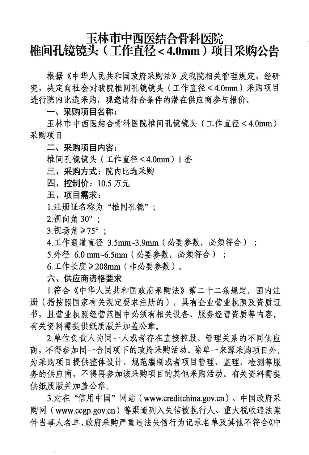 玉林市中西医结合骨科医院椎间孔镜镜头(工作直径<4.0mm)项目采购公告