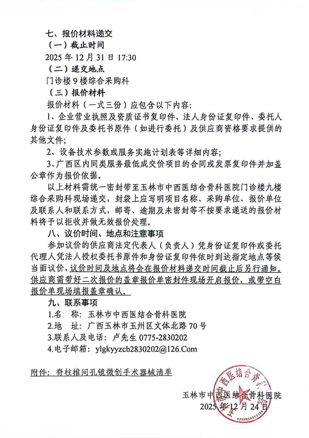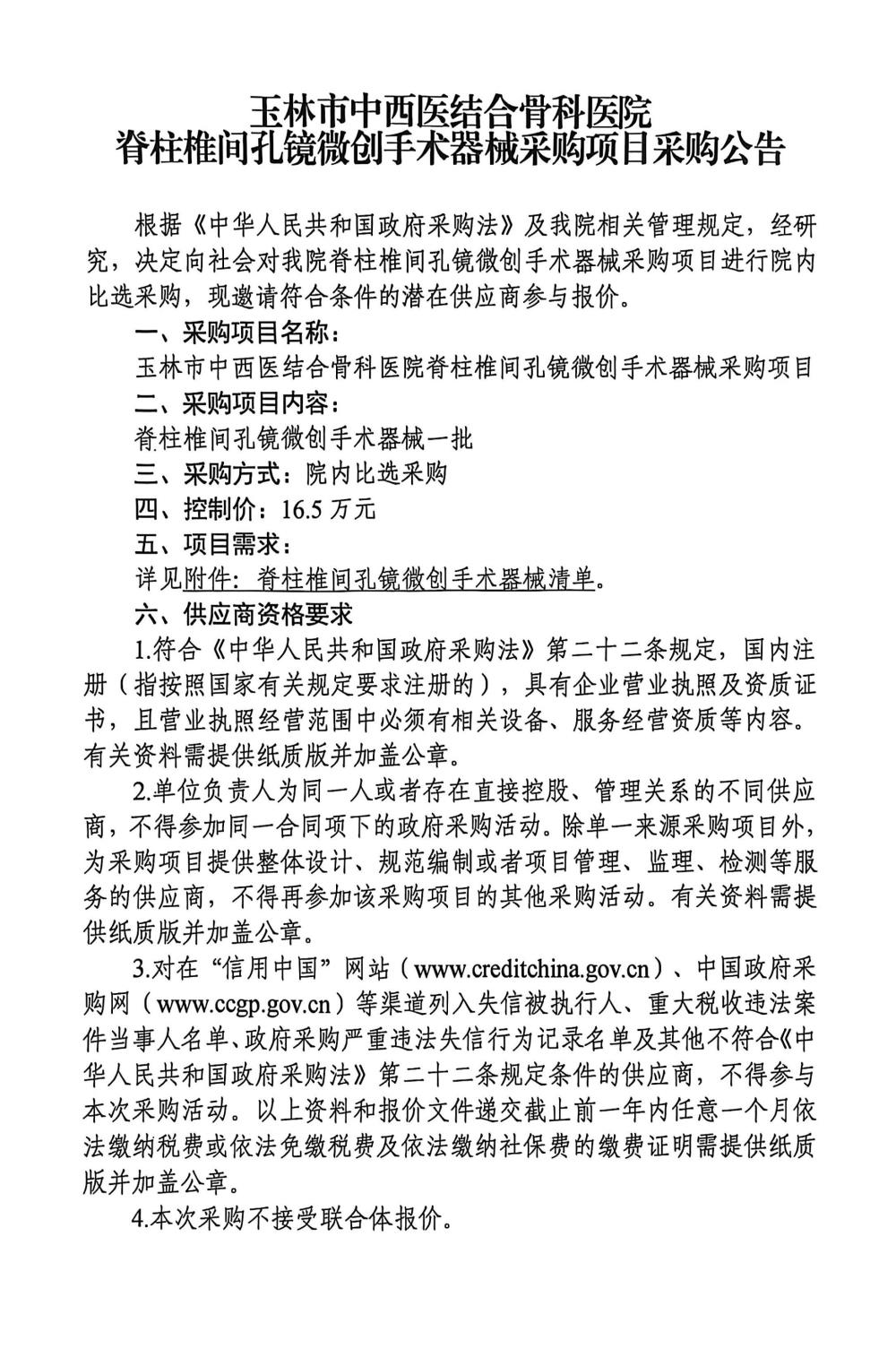 玉林市中西医结合骨科医院脊柱椎间孔镜微创手术器械采购项目采购公告