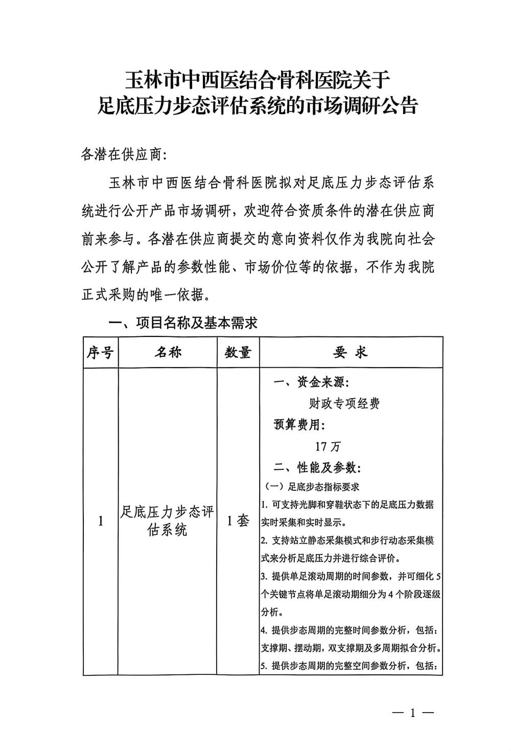 玉林市中西医结合骨科医院关于足底压力步态评估系统的市场调研公告