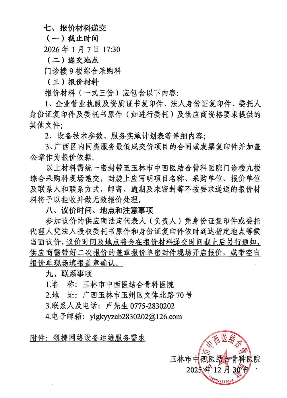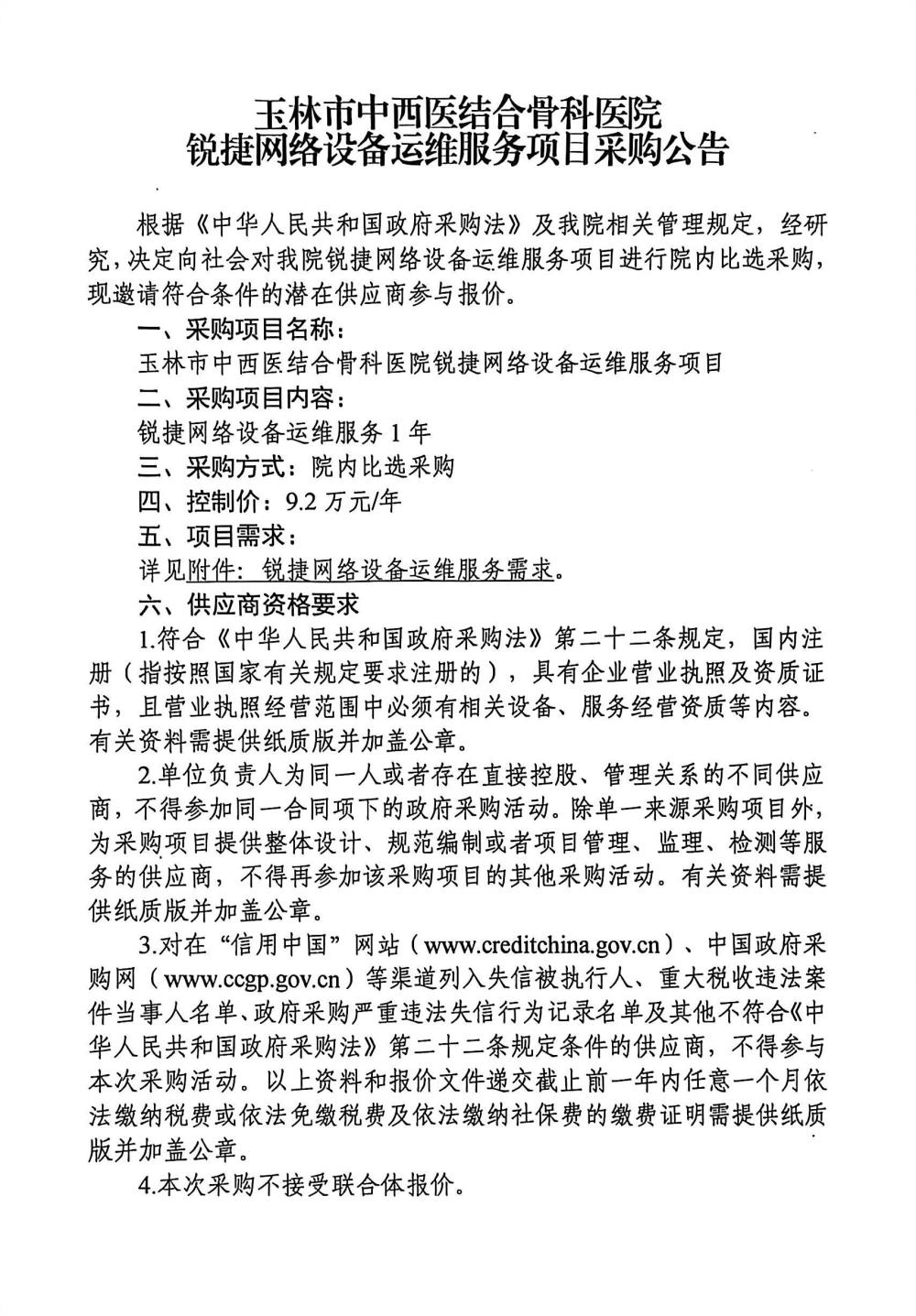 玉林市中西医结合骨科医院锐捷网络设备运维服务项目采购公告